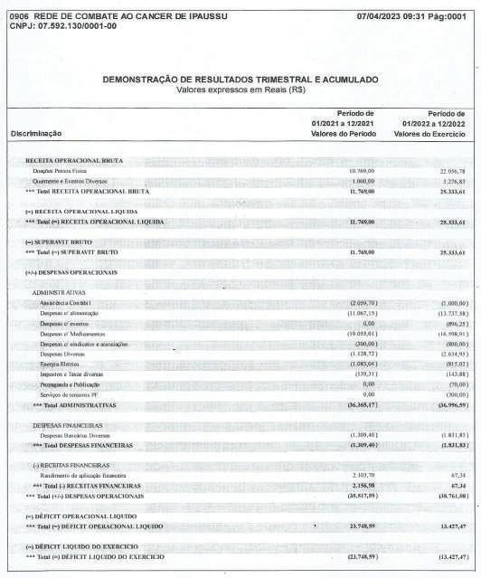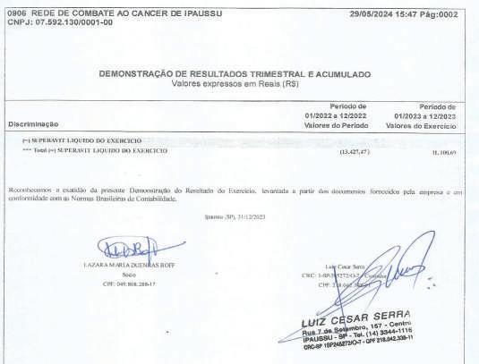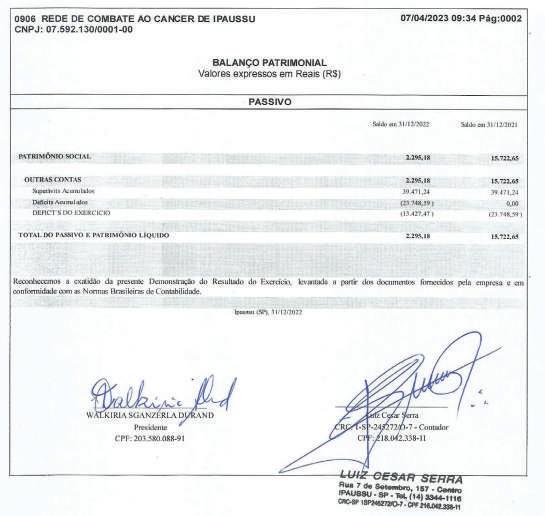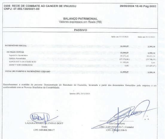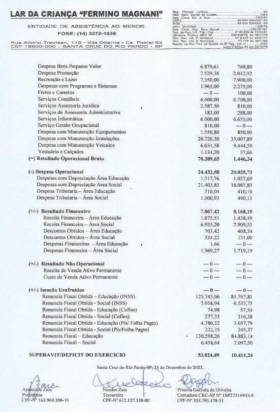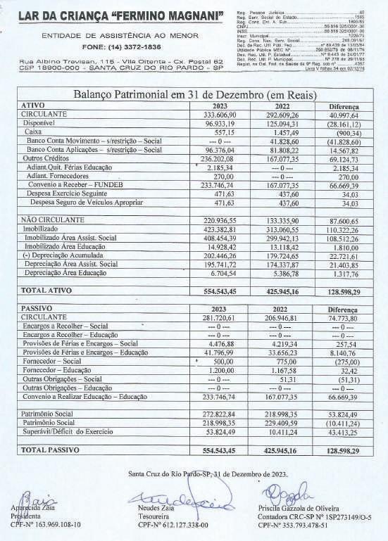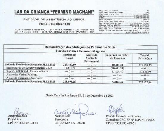 Associação Infanto-Juvenil Maria Vitória CNPJ 06.103.799/0001-28 Rua Marechal Bitencourt, 434 – 18900-077 – Santa Cruz do Rio Pardo – SP Utilidade Pública Municipal: Lei 2186/07 Estadual: Lei 13144/08 Federal: Port. 1788/08 - IV Demonstração de Resultado do Exercício Findo em 31 de Dezembro CONTAS DE RESULTADO 2023 2022 20 RECEITAS DIVERSAS 144.724,49 47.003,88 132.458,01 RECEITAS OPERACIONAIS – ASSIST.SOCIAL 144.724,49 47.003,88 132.458,01 Receita de Convenio Conv Municipal – Pref.Municipal SCRPardo-CMDCA 94.235,37 94.235,37 0 0 99.581,87 99.581,87 Receitas Diversas 44.823,73 42.802,42 31.577,00 Donativo em Dinheiro Pessoa Jurídica Donativo em Dinheiro Pessoa Física Donativo em Dinheiro Anônimo Receita de Promoção 0 350,00 0 18.313,73 0 0 0 16.654,42 6.629,00 Trabalhos Voluntários 26.160,00 26.148,00 24.948,00 Receitas Financeiras Descontos Obtidos Receita Rendimento Aplicação DESPESAS DIVERSAS DESPESA – ASSISTENCIA SOCIAL Despesas Com Pessoal Pessoal Voluntários Despesas Administrativas/Social Despesas Expediente Despesas de Promoção Despesa com Doação Efetuadas “Santa Casa” Despesas com Manutenção Manutenção c/ Equipamentos Manutenção c/ Instalações Despesa Bancária Tarifas Bancárias Despesas Tributárias I.R.R.F s/Aplicação Taxas e Emolumentos 5.665,39 50,08 5.615,31 129.749,15 129.749,15 26.160,00 26.160,00 98.567,83 3.722,30 0 94.845,53 2.692,40 1.481,30 1.211,10 867,80 867,80 1.461,12 121,61 993,41 224,60 121,50 4.201,46 0 4.201,46 39.124,93 39.124,93 26.148,00 26.148,00 11.344,62 1.122,57 106,23 10.115,82 0 0 0 864,50 864,50 767,81 0 599,76 168,05 0 1.299,14 1.297,65 129.739,92 129.739,92 24.948,00 24.948,00 103.414,81 102.632,57 1.204,95 1.204,95 Superávit do Exercício 14.975,34 7.878,95 2.718,09 Associação Infanto-Juvenil Maria Vitória CNPJ 06.103.799/0001-28 Rua Marechal Bitencourt, 434 – 18900-077 – Santa Cruz do Rio Pardo – SP Utilidade Pública Municipal: Lei 2186/07 Estadual: Lei 13144/08 Federal: Port. 1788/08 - IV Demonstração das Mutações do Patrimônio Social Associação Infanto Juvenil Maria Vitória Patrimônio Social Ajuste de Avaliação Patrimonial Superávit ou Déficit do Exercício Total do Patrimônio Saldo do Patrimônio Social em 31.12.2022 36.445,56 0 7.878,95 44.324,51 Incorporação do Superávit/Déficit (2022) 7.878,95 0 (7.878,95) 0 Superávit/Déficit do Exercício Social 0 0 14.975,34 14.975,34 Ajuste das Verbas Publicas 0 0 0 0 Ajuste de Exercícios Anteriores 0 0 0 0 Saldo do Patrimônio Social em 31.12.2023 44.324,51 0 14.975,34 59.299,85 Demonstração das Origens e Aplicações de Recursos 2023 2022 I - Origens Superávit 14.975,34 7.878,95 Ajuste Exercício Anteriores 0 0 Total das Origens 14.975,34 7.878,95 II – Aplicações 0 0 III – Aumento (Redução) Capital Circulante Liquido 14.975,34 7.878,95 IV – Demonstração Variação de Capital Circulante Liquido Variação Ativo Circulante 15.050,94 7.879,69 Variação Passivo Circulante 75,60 0,74 Aumento (Redução) do Capital Circulante Liquido 14.975,34 7.878,95 Associação Infanto-Juvenil Maria Vitória CNPJ 06.103.799/0001-28 Rua Marechal Bitencourt, 434 – 18900-077 – Santa Cruz do Rio Pardo – SP Utilidade Pública Municipal: Lei 2186/07 Estadual: Lei 13144/08 Federal: Port. 1788/08 - IV DEMONSTRAÇÃO DO FLUXO DE CAIXA – DFC Santa Cruz do Rio Pardo-SP, 31 de Dezembro de 2023 Anselmo Poli Junior Priscila Gazzola de Oliveira Presidente Contadora CRC-SP Nº 1SP273149/O-5 CPF-Nº 078.903.248-12 CPF-Nº 353.793.478-51 PARECER DO CONSELHO FISCAL Reconhecemos a exatidão do presente Balanço Patrimonial, da entidade Associação Infanto-Juvenil Maria Vitória “AMV”, relativo ao período de 01 de Janeiro de 2023 a 31 de Dezembro de 2023, somando a importância de R$-59.393,41==(cinquenta e nove mil, trezentos e noventa e três reais, quarenta e um centavos)==. Santa Cruz do Rio Pardo-SP, 31 de Dezembro de 2023. Luciane Fernandes José Dorivaldo Zaia CPF-nº 120.231.768-59 CPF-nº 601.669.408-87 RG-nº 18.653.068-7 SSP/SP RG-nº 6.098.082 SSP/SP Walter Henares Filho CPF-Nº 469.792.477-00 RG-Nº 973.349 SSP/SP Discriminação 2023 2022 Fluxo de Caixa das Atividades Operacionais Superávit do Exercício 14.975,34 7.878,95 Depreciação do Exercício 0 0 Variação de Contas de Credito 0 0 Variação de Estoque 0 0 Variação de Contas a Pagar 0 0 Variação de Obrigações Trabalhistas Sociais e Fiscais 2,70 0,74 Variação de Provisões de Férias e Encargos 0 0 Variação de Fornecedores 72,90 0 Ajuste de Exercício Anteriores 0 0 (=) Caixa Liquido da Atividades Operacionais 15.050,94 7.879,69 Fluxo de Caixa das Atividades de Investimentos (+) Baixa Imobilizado 0 0 (=) Caixa Liquido das Atividades Investimentos 0 0 (=) Geração Liquido de Caixa 15.050,94 7.879,69 (+) Saldo Inicial de Caixa 44.342,47 36.462,78 (-) Saldo do Caixa Final 59.393,41 44.342,47 Associação Infanto-Juvenil Maria Vitória CNPJ 06.103.799/0001-28 Rua Marechal Bitencourt, 434 – 18900-077 – Santa Cruz do Rio Pardo – SP Utilidade Pública Municipal: Lei 2186/07 Estadual: Lei 13144/08 Federal: Port. 1788/08 - IV Balanço Patrimonial em 31 de Dezembro (em Reais) ATIVO 2023 2022 Diferença CIRCULANTE 59.393,41 44.342,47 15.050,94 Disponível 59.393,41 44.342,47 15.050,94 Caixa 227,35 126,31 101,04 Banco Conta Movimento 2.225,60 2.085,71 139,89 Banco Conta Aplicação 56.940,46 42.130,45 14.810,01 Estoques 0 0 0 Material p/Doação UTI 0 0 0 TOTAL ATIVO 59.393,41 44.342,47 15.050,94 PASSIVO 2023 2022 Diferença CIRCULANTE 93,56 17,96 75,60 Obrigações Sociais 20,66 17,96 2,70 Cofins a Pagar 19,36 16,66 2,70 Pis – Faturamento 1,30 1,30 0 Fornecedores 72,90 0 72,90 Patrimônio Liquido 59.299,85 44.324,51 14.975,34 Patrimônio Social 44.324,51 36.445,56 7.878,95 Superávit do Exercício 14.975,34 7.878,95 7.096,39 TOTAL PASSIVO 59.393,41 44.342,47 15.050,94