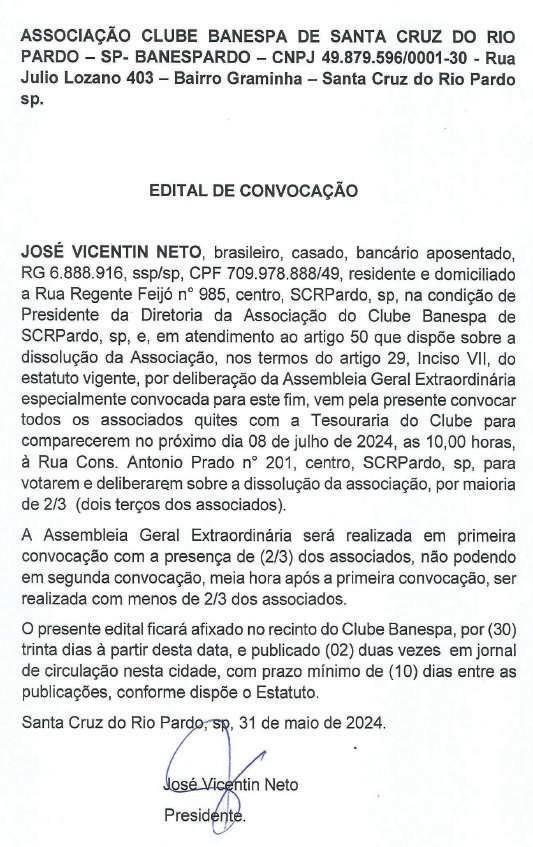 EDITAL DE CONVOCAÇÃO ASSEMBLEIA GERAL ORDINÁRIA DE ELEIÇÃO PARA DIRETORIA E CONSELHO FISCAL DO CENTRO SOCIAL SÃO JOSÉ TRIÊNIO 2024/2027 O Centro Social São José, por seu Presidente, no uso de suas atribuições, faz publicar o presente edital e CONVOCA todos os seus associados para Assembléia Geral Ordinária para a eleição da Diretoria e Conselho Fiscal para o triênio 2024/2027, a realizar-se no dia 19 de junho de 2024 às 19h, em primeira convocação, com a presença de 2/5 de seus associados, e, em segunda convocação, com qualquer número de presentes, nos termos do artigo 20, parágrafo único, de seu Estatuto Social, na sua sede sito a Rua Francisco Carlomagno n.º 265 – Vila Fabiano, na cidade e Comarca de Santa Cruz do Rio Pardo/SP O registro das chapas deverá ser realizado na sede do Centro Social São José, mediante requerimento nos moldes do Estatuto Social vigente, até 05 (cinco) dias antes da realização do pleito, com a declaração de seus componentes de que autorizam a inclusão de seus nomes na referida chapa conforme artigo 25 E para que chegue ao conhecimento de todos e que para no futuro não se venha a alegar ignorância, foi expedido o presente edital que será afixado na sede do Centro Social São José e publicado na imprensa local Santa Cruz do Rio Pardo/SP, 07 de junho de 2024. ELCIO JOSÉ BELEI Presidente do Centro Social São José