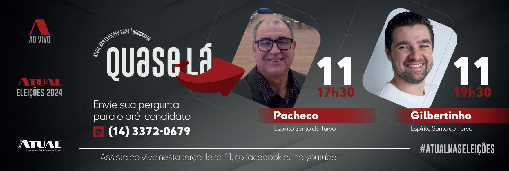 entrevista será às 19h30, com Gilberto Bertolino. Já nos dias 17 e 18, os pré-candidatos de Ipaussu, Ana Cândido e Luiz Carlos Souto, serão os sabatinados da vez. O programa será transmitido ao vivo pelo Facebook e Youtube do Atual , e internautas também podem participar enviando suas perguntas pelo WhatsApp (14) 3372-0679. Além de Espírito Santo do Turvo e Ipaussu, também são convidados para participar da sabatina os pré-candidatos dos mu-