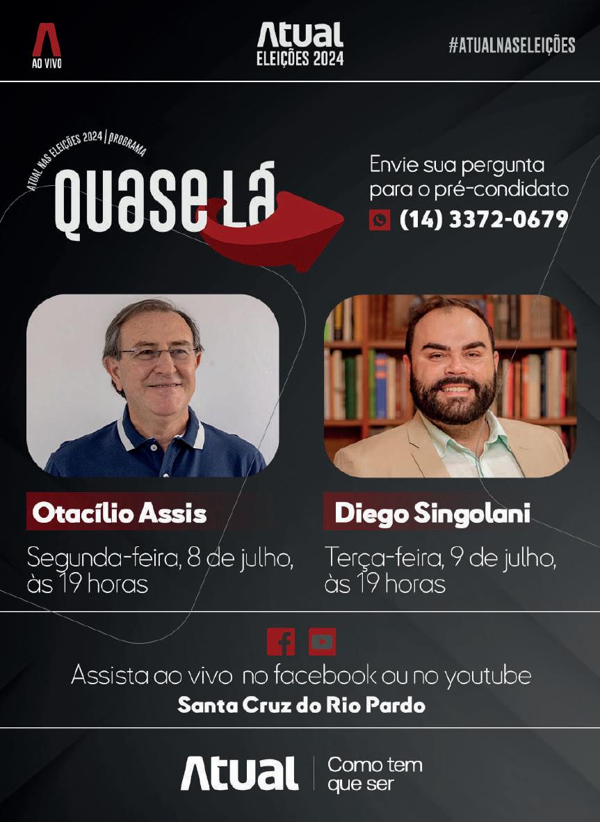 • Nos dias 8 e 9 de julho, o Atual entrevistará os pré-candidatos a prefeito de Santa Cruz, Otacílio Assis (PL) e Diego Singolani (PSD). Mesmo tendo que correr atrás de quem estava fugindo da gente por dias, conseguimos confirmar a primeira das muitas etapas que marcam nossa cobertura eleitoral no município.