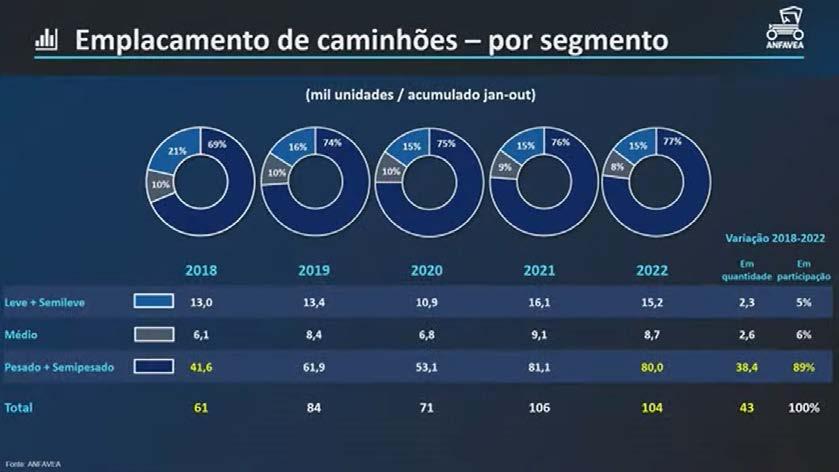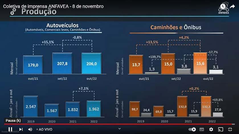 As vendas das montadoras devem terminar 2022 em um patamar similar ao do ano passado. No que tange à eletrificação, o setor ainda tem um caminho longo a percorrer. Os resultados preliminares do ano, até outubro, já apontam que as vendas de autoveículos novos, incluindo automóveis, comerciais leves, caminhões e ônibus deverão terminar o ano em um patamar, segundo a projeção da Anfavea, de 2,140 milhões.