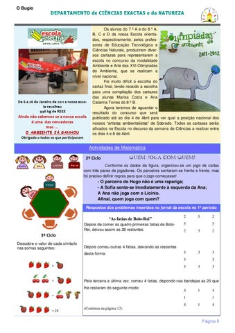 - O parceiro do Hugo não é uma rapariga; - A Sofia senta-se imediatamente à esquerda da Ana; A Ana não joga com o Licínio. Afinal, quem joga com quem? Respostas dos problemas inseridos no jornal da escola no 1º período