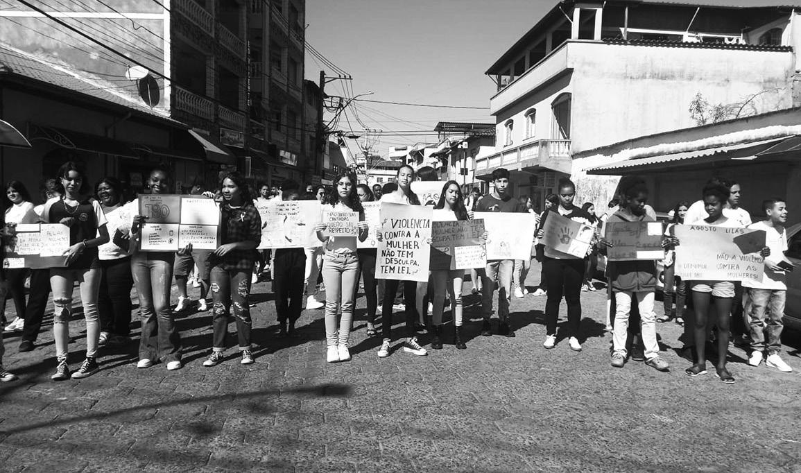 A iniciativa de realizar uma passeata partiu das professoras Sil des, Flávia Cristina e Nelma. No mês de março, em comemoração ao dia e mês da mulher, elas propuse ram a seus alunos que fizessem um trabalho sobre mulheres que muda ram o mundo. “Nesse trabalho, os primeiros anos e o turno da noite pesquisaram sobre mulheres que fizeram algo de importante para o mundo. Entre as mulheres que su gerimos, havia o nome da Maria da Penha. Eles pesquisaram e ficaram muito interessados na história de vida dela e na lei que leva o seu nome”, disse a professora Nelma. Eu estava nas redes sociais e vi que neste ano se completaram 16 anos da lei Maria da Penha e que o Sena do havia aprovado um projeto de lei que institui em todo país o ‘Agos to Lilás’, mês a ser dedicado para conscientização do fim da violência contra a mulher. Isso me fez pensar em continuar o trabalho que tinha começado em março. Foi aí que levei a proposta para o grupo de coordenação do Novo Ensino Mé dio durante uma reunião; a seguir, levamos para sala de aula. O projeto era fazer cartazes físicos e digitais para divulgarmos no dia do even to. Levamos a sugestão de fazer uma passeata para conscientização da população de Resende Costa. A direção da escola abraçou a causa, conseguiu as parcerias e resolveu promover o evento”, acrescentou a professora.Nelma chama a atenção para a importância de temas como esse serem discutidos nas escolas. “É relevante para que possamos fazer