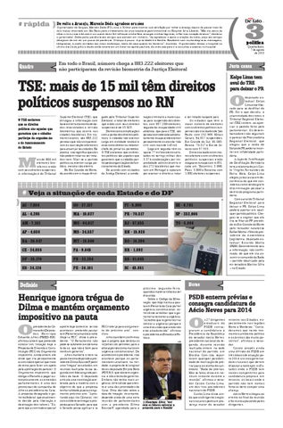 Superior Eleitoral (TSE), que divulgou a informação com base em levantamento de dados relacionados à revisão biométrica que ocorre nas cidades brasileiras. Em números exatos, são 883.222 pessoas que não compareceram às suas seções eleitorais para atualizar seus dados. Na prática, isso significa que eles não podem votar ou ser votados nem filiar-se a partido político ou exercer cargo público, mesmo não eletivo. No Rio Grande do Norte, de acordo com o mapa divul-