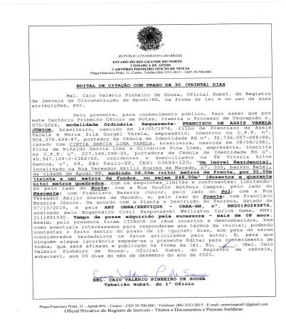 SEMI-INTEGRADA para a elaboração de projeto executivo de engenharia e Construção do Bloco de Laboratórios e Salas Multiusuários, nos Campi da UFERSA em Angicos/RN e Caraúbas/ RN. Total de itens: 2. Entrega das Propostas: a partir de 12/12/2025 às 08:00hs no site www.gov.br/compras. Abertura das Propostas: 03/02/2026 às 09:00hs (horário de Brasília). Edital disponível no site https://licitacao.ufersa.edu.br/https-licitacao-ufersa-edu-br-avisosde-licitacoes-editais/ e ainda no site www.gov.br/compras. Para informações: (84) 3317-8287. Mossoró-RN, 12 de dezembro de 2025 Lissandro Arielle Vale Batista Diretor da Divisão de Aquisição de Material e Serviços