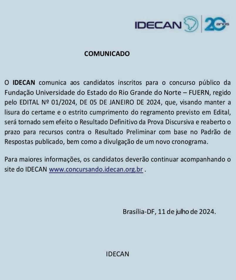 IDECAN torna sem efeito resultado da prova discursiva do concurso da Uern