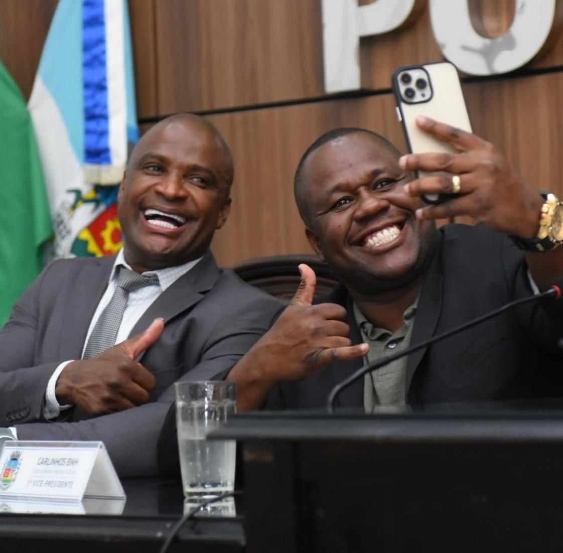 Em momento descontraído, Carlinhos BNH, (direita), ao lado do vereador Vaguinho Neguinho em foto da última sessão na Câmara de Nova Iguaçu