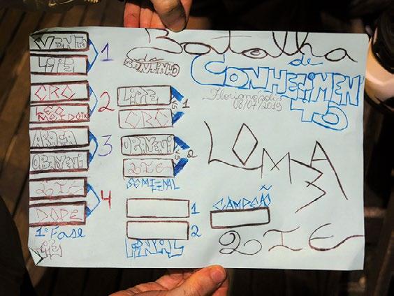 oda segunda-feira à noite rola a Batalha da Lomba do Santinho. Para as sessões de versos improvisados se reúnem rimadores não só daqui, mas que vêm de outros lugares da Ilha e da Grande Florianópolis. A equipe do Jornal do Zinga acompanhou o encontro de 8 de julho. Mesmo naquela noite de inverno à beira do mar, a galera foi chegando aos poucos, com seus típicos bonés, toucas, moletons com capuz e calças largas para se proteger do frio e fazer estilo também.