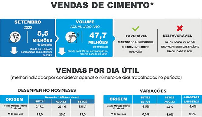 Em setembro, a comercialização do produto registrou queda de 3,8% em relação ao mesmo mês de 2021, segundo o Sindicato Nacional da Indústria do Cimento (SNIC). Ao se analisar o despacho de cimen to por dia útil em setembro, de 238,4 mil toneladas, verificou-se um aumento de 1,6% em comparação a agosto e uma queda de 3,5% sobre mesmo mês do ano passado. No acumulado de janeiro a setembro foram vendidas 47,7 milhões de toneladas, recuo de 3,0%.