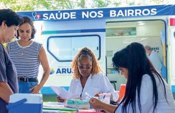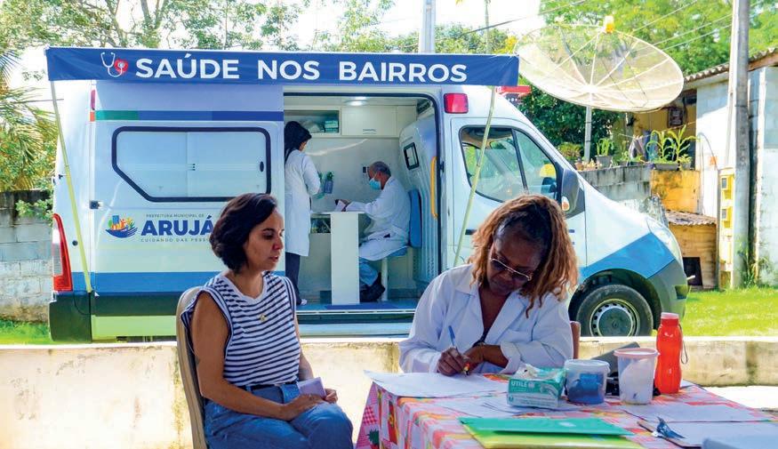 O Saúde nos Bairros é uma ação fundamental para a cidade, pois visa cuidar das pessoas que moram nos bairros distantes do centro. E os serviços prestados aos arujaenses, inclusive aos da área rural, são: consulta médica; consulta ginecológica; atendimento de enfermagem; coleta de Papanicolau; veri cação de pressão arterial; controle dextro e coleta de exames laboratoriais.