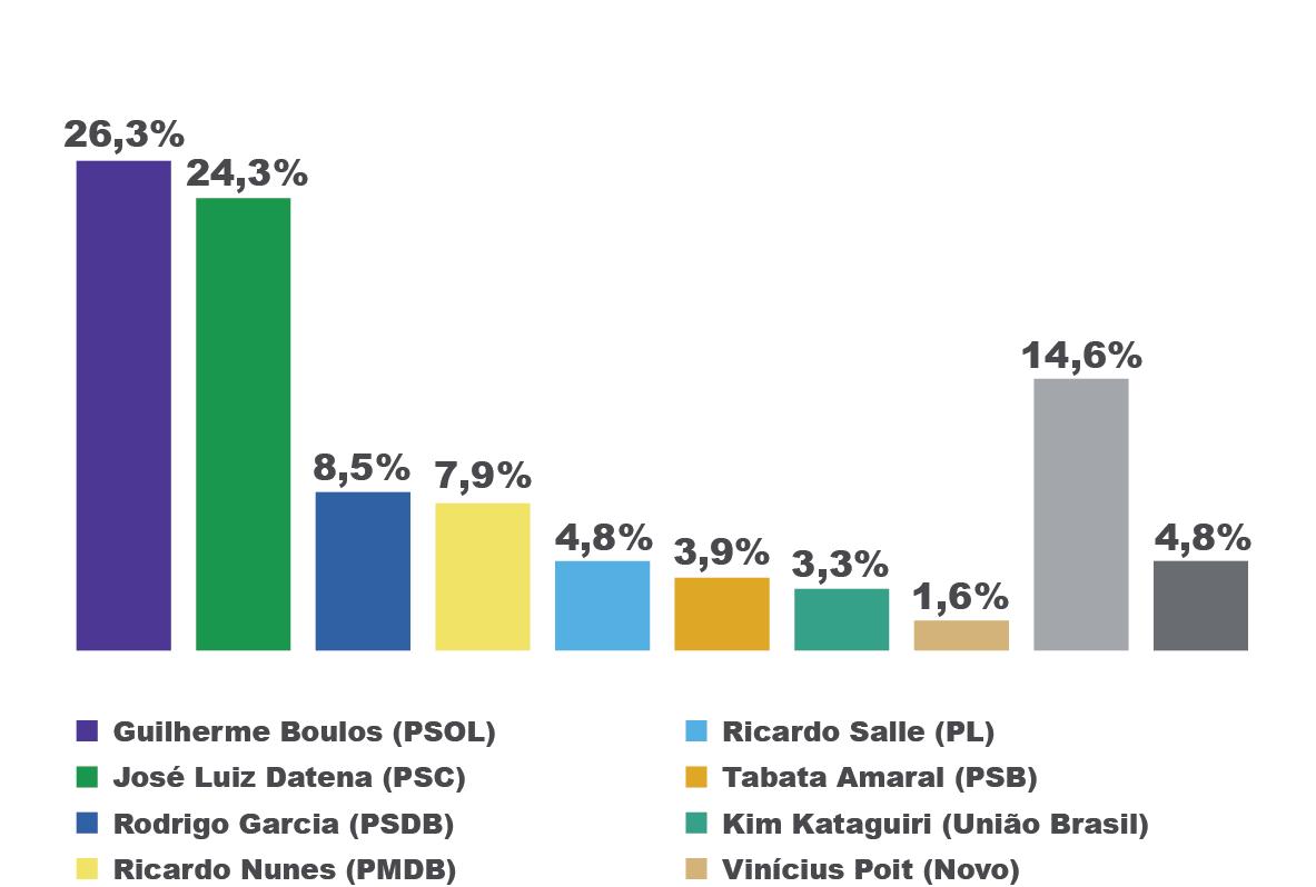 No primeiro cenário, Guilherme Boulos tem 26,3% dos votos, seguido pelo apresentador de TV, José Luiz Datena (PSC), com 24,3%, o ex-governador de SP, Rodrigo Garcia (PSDB), com 8,5%, e o atual prefeito da capital, Ricardo Nunes (PMDB), com 7,9%. Na sequência estão os deputados federais Ricardo