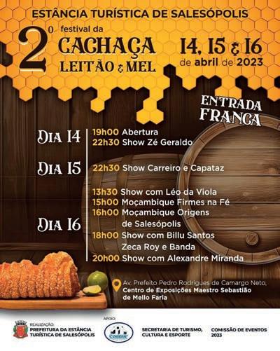 “Mês de abril é mês de festa em Salesópolis. Teremos as melhores cachaças de Salesópolis e de toda a região, além de comidas típicas e muita música raiz”, convida o prefeito Vanderlon Gomes (PL).