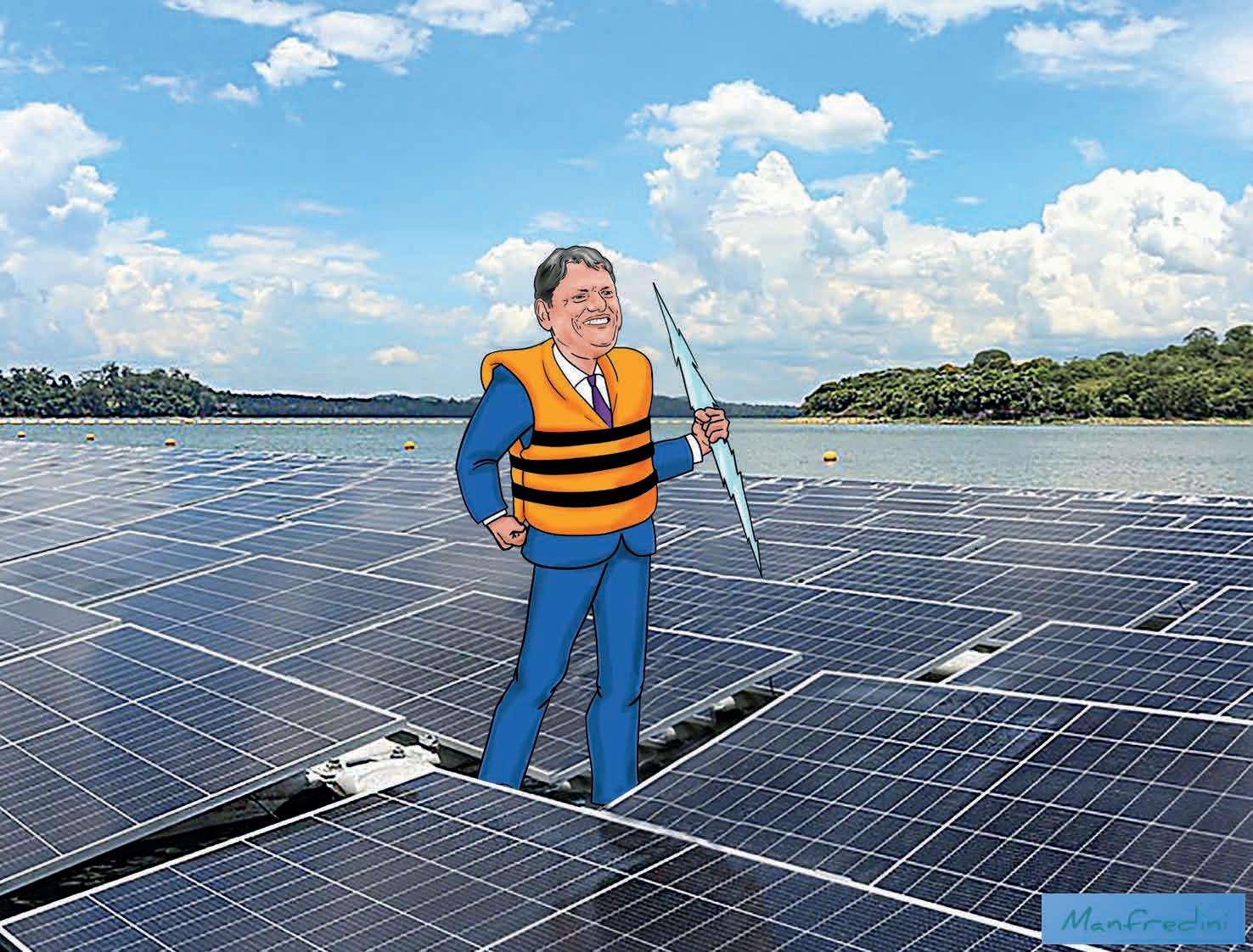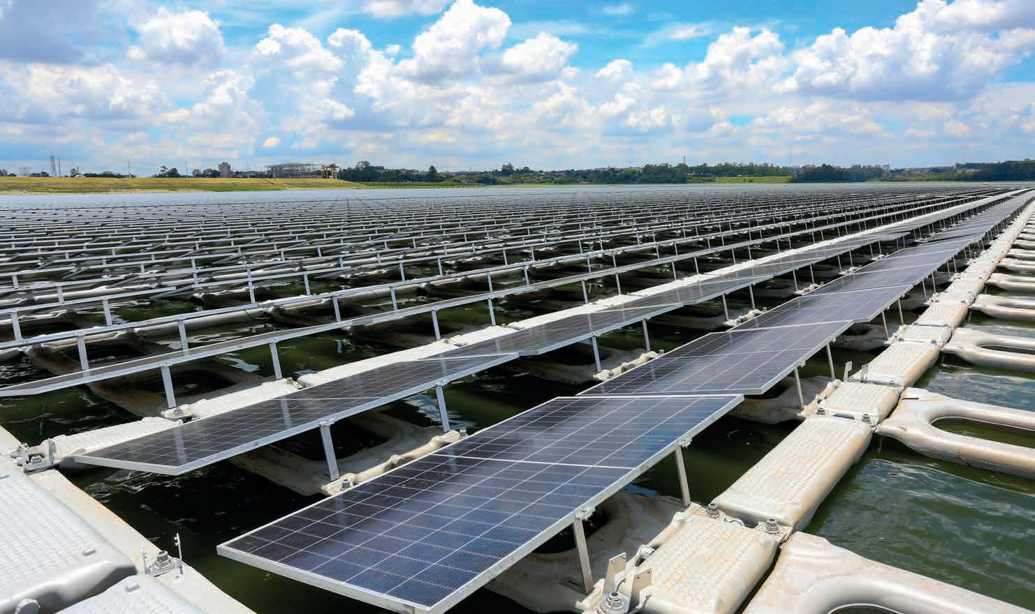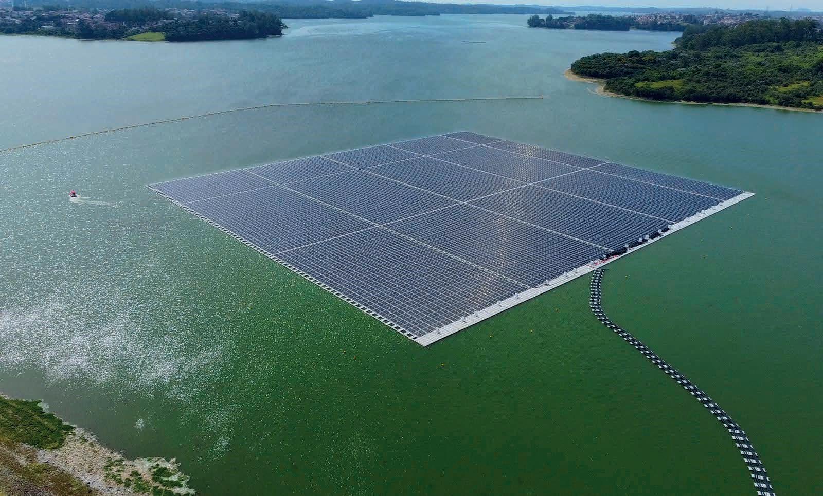 lar utuante na represa Billings. O país lidera a transição energética na América Latina, com 37,2 GW de capacidade, superando grandes hidrelétricas globais. Investimentos em tecno-