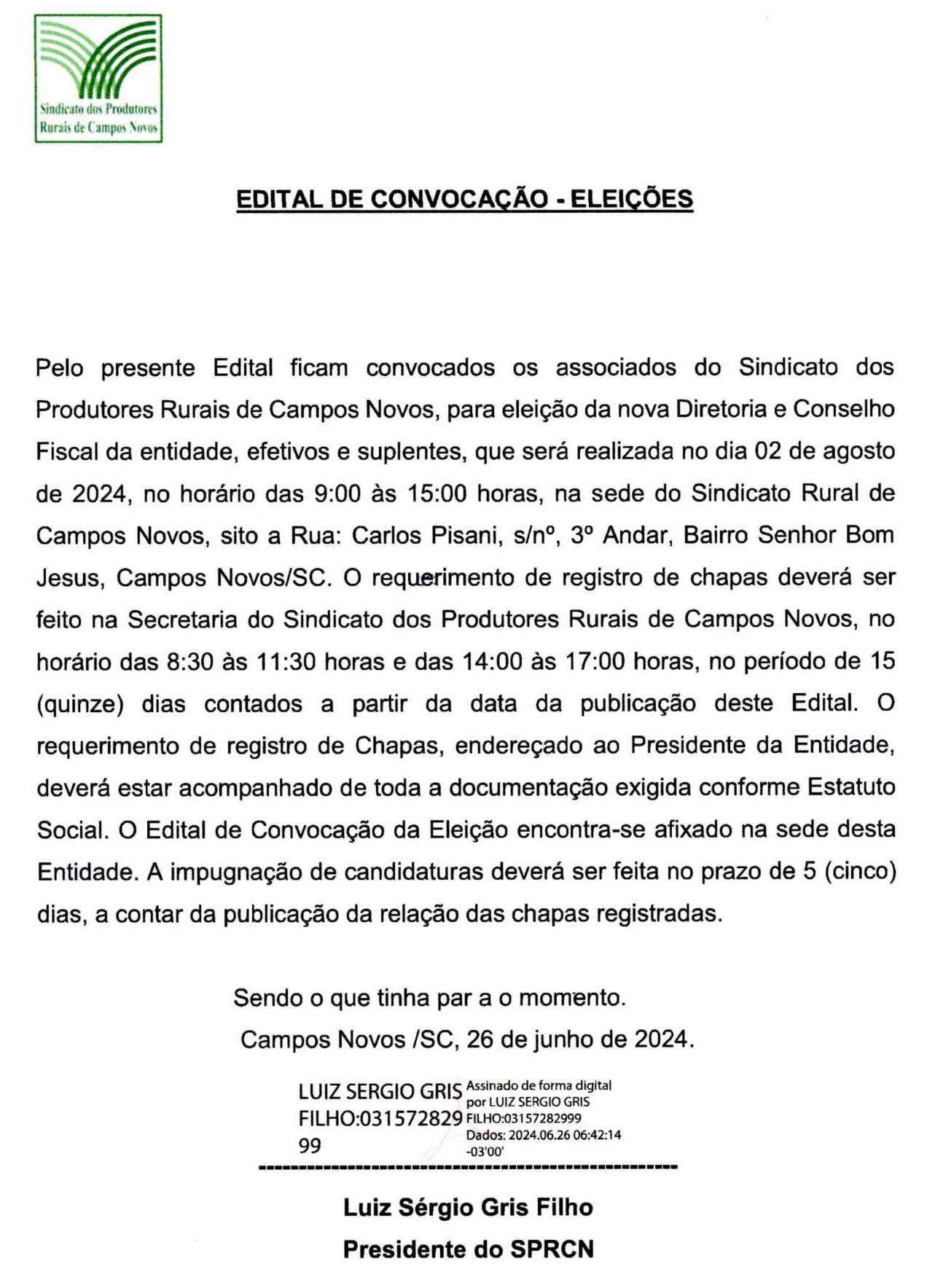 tor agropecuário. Então essa é a nossa função, defender o produtor rural de Campos Novos da região” comentou o presidente do Sindicato, Luiz Sérgio.