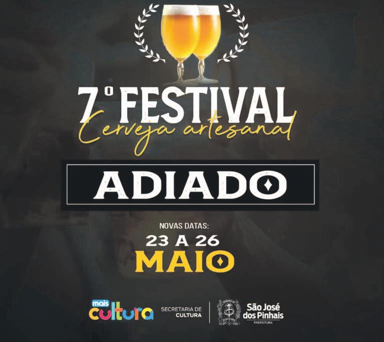 Visando a segurança e bemestar dos cidadãos, a Prefeitura de São José dos Pinhais, por meio da Secretaria de Cultura (Semuc), informa que, devido às condições meteorológicas, o Festival da Cerveja Artesanal, que ocorreria neste final de semana no Parque São José, foi adiado para os dias 23 a 26 de maio.
