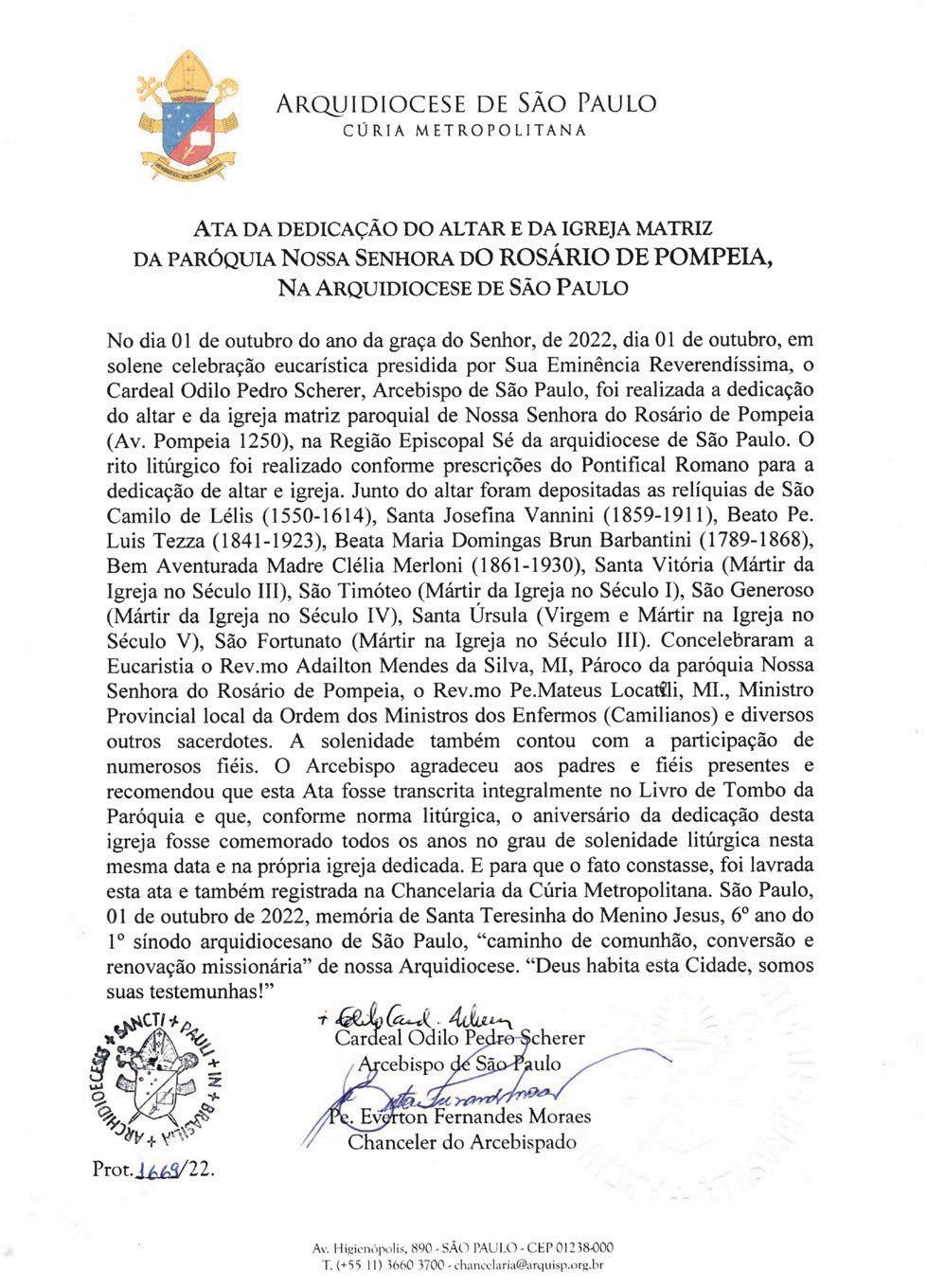 Antes da bênção nal, o Arcebispo recordou que a cada ano, em 9 de outu bro, deve ser celebrado o aniversário de dedicação da Igreja Santa Teresinha do Menino Jesus. E não há como esquecer, já que na entrada principal foi inaugura da uma placa comemorativa da data.