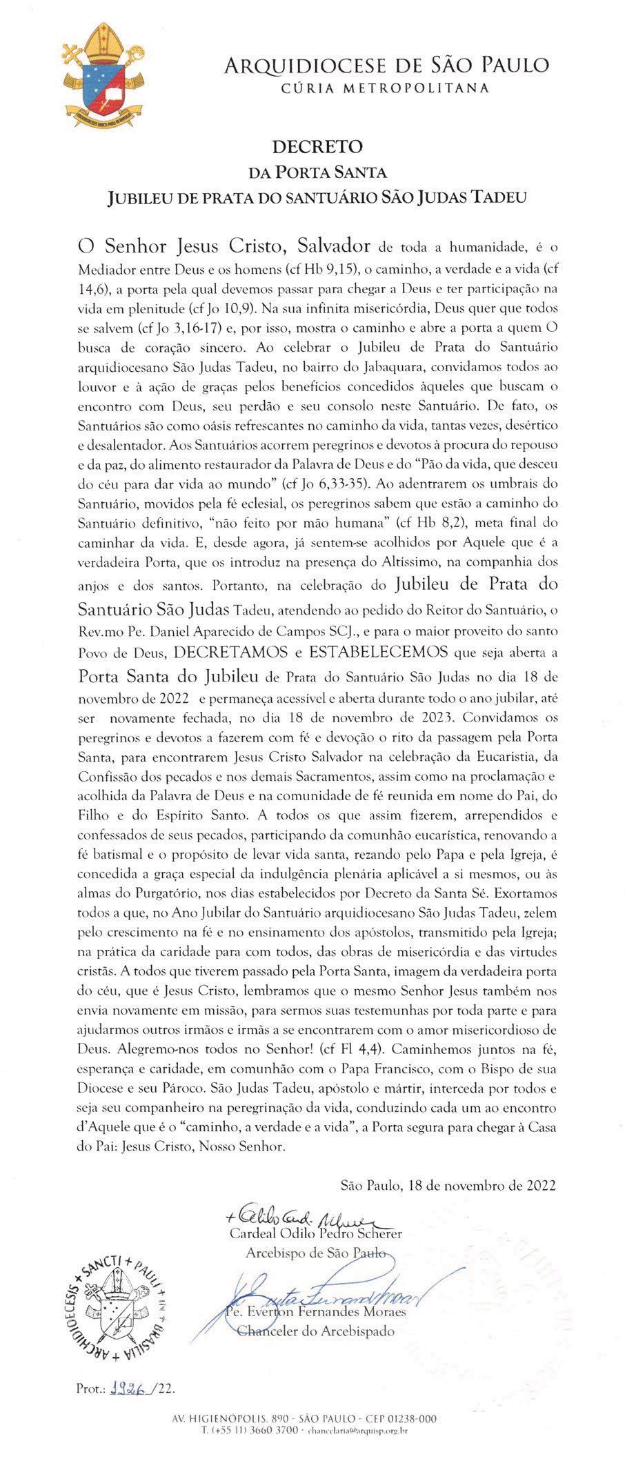 Na comemoração dos 25 anos da eleva ção da igreja matriz da Paróquia São Judas Tadeu à dignidade de santuário, no bairro do Jabaquara, o Cardeal Scherer presidiu missa pela abertura do ano jubilar, na sexta-feira, 18. Na ocasião, o Arcebispo Metropolitano abriu a Porta Santa, que assim permanece rá até novembro de 2023 na ‘igreja antiga’ do