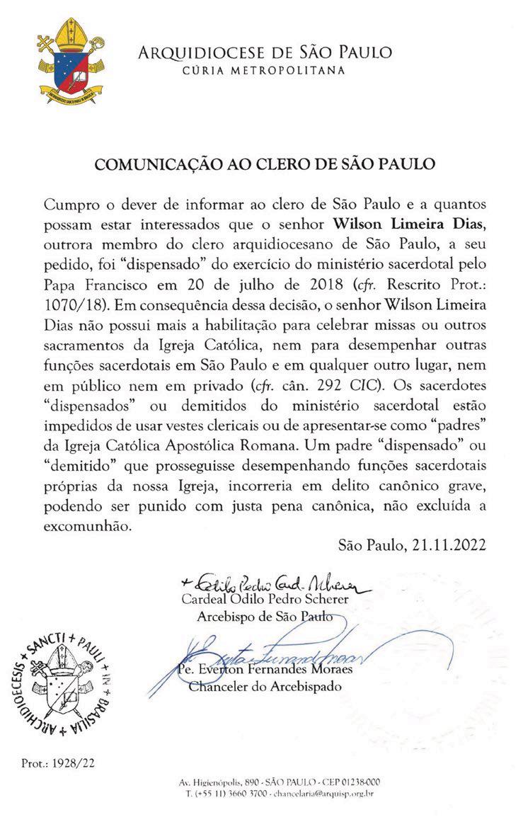 fato de não ter sido consultado sobre a decisão. No texto, a Santa Sé diz ainda esperar que “episódios semelhantes não se repitam”.