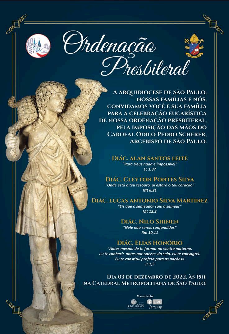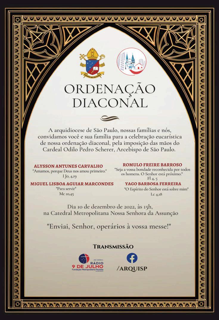 Em 18/11/2022, foi nomeado e pro visionado como Assistente Pastoral do Santuário Arquidiocesano Nossa Senhora Aparecida, no bairro do Ipi ranga, na Região Episcopal Ipiranga, o Diácono seminarista Felipe Batista da Silva, pelo período de 1o de novembro