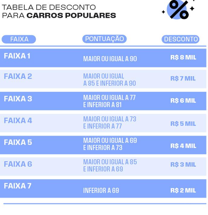 Nesse caso, os noventa pontos somados classificariam o veículo na primeira faixa, que permite o maior desconto, de R$ 8 mil (conforme tabela 2). O veículo, que inicialmente seria no valor de R$ 120 mil, passaria a custar R$ 112 mil
