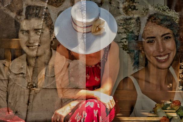 Ana Pose – Três gerações – Genética Reciclada – Obra fotográfica – chapéu de brechó na protagonista, moldura de porta-retratos reaproveitado.