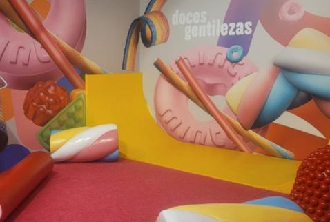 Oterativas, além de novas degustações. Ao todo, são 15 ambientes onde terão instalações com doces em grande escala e sala imersiva com projeções. Além disso, a estrutura da exposição conta com um aplicativo de realidade aumentada, em que os doces de cada sala ganharão vida própria para poses inusitadas com personagens e paredes que se moverão.