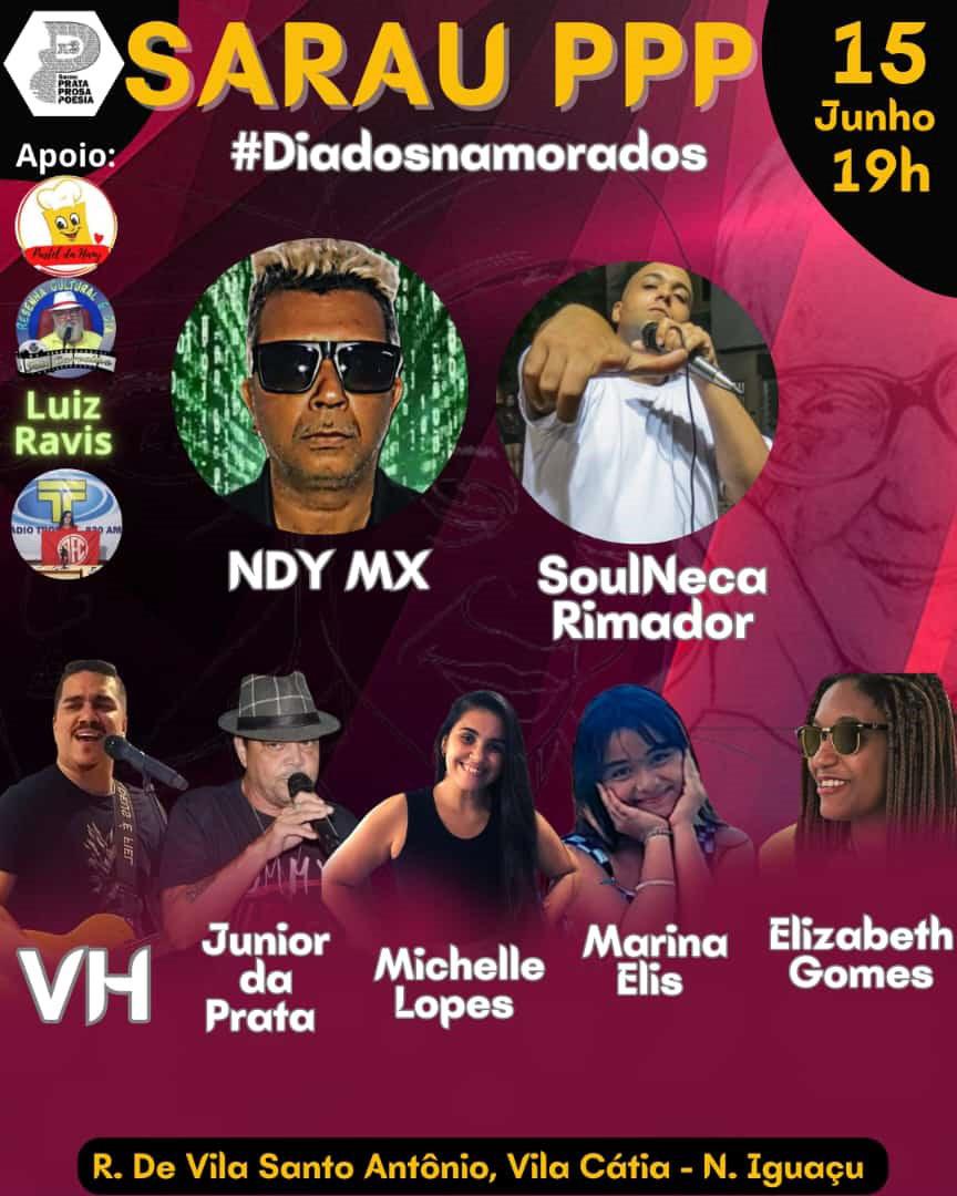 A direção do PPP manda dizer o seguinte: nesta quinta-feira, 15, a partir das sete da noite, vai rolar mais uma edição do Sarau mais bonito da cidade. "Confere aí, no flyer, as atrações especialíssimas que vão quebrar tudo em nosso palco e celebrar o Dia dos Namorados (13 de junho). Também teremos microfone aberto, sorteio de livros e muito mais. Vem viver amor e liberdade no PPP!". Esta Resenha Cultural & Cia apoia o evento que acontece, mensalmente, no bairro Prata, em Nova Iguaçu. Estão na relação das atrações, NDY MX, SoulNeca Rimador, VH (fundador), Júnior da Prata (fundador), Michelle Lopes (fundadora), a pequena cantora Marina Elis e Elizabeth Gomes. O endereço é Rua de Vila Santo Antônio, Campo do Barrinho, Vila Cátia, Prata, Nova Iguaçu.
