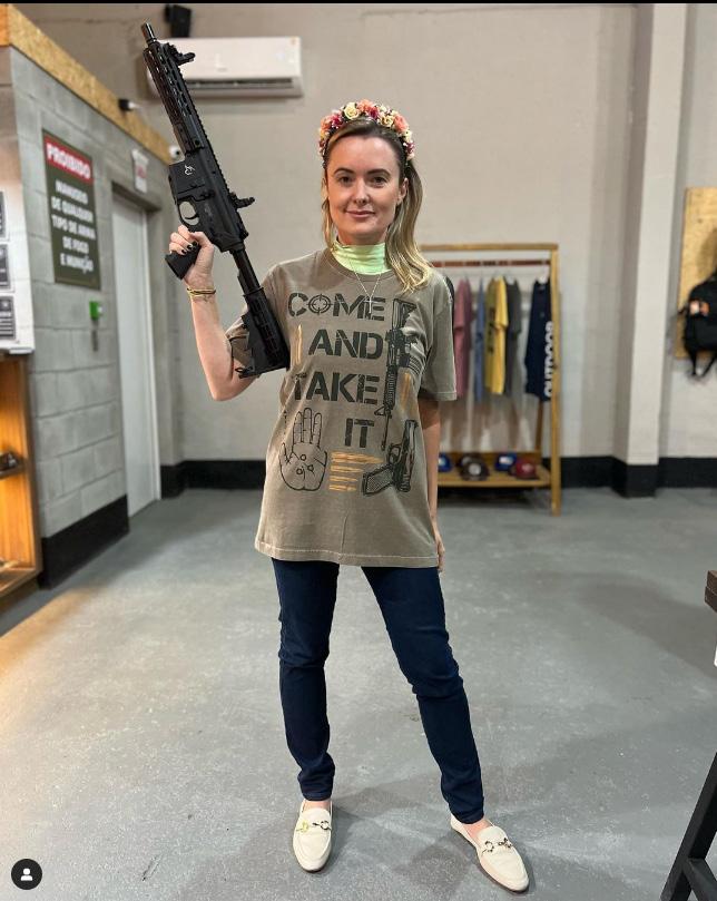 Na postagem, Júlia Zanatta usou camiseta com o desenho de uma mão com quatro dedos alvejada por três tiros, além de imagens de armas e os dizeres “come and take it” (“venha pegar”)