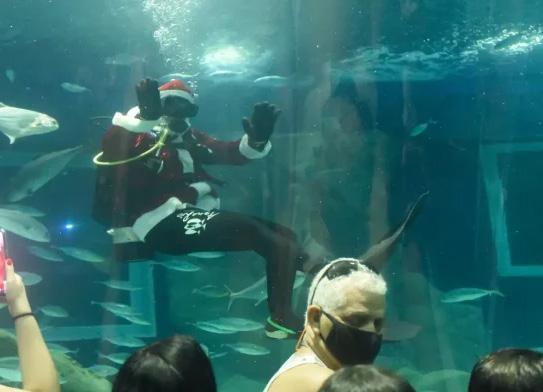 Ofim de ano no Rio de Janeiro terá um papai noel mergulhador no Grande Tanque Oceânico do AquaRio, onde vivem mais de 2 000 animais, como os tubarões. Neste ano, o público poderá ver o Bom Velhinho mergulhando entre os dias 21 a 25 de dezembro, sempre às 13h30, horário em que os animais são alimentados. Entre as figuras mais famosas do AquaRio estão os tubarões Donald e do Gastão, da espécie Mangona (Carcharias Taurus), do carismático casal de tubarões-leopardo (Stegostoma fasciatum) Zeca e Ritinha, e de outros duas mil espécies de peixes. Ao todo, são 11 tratadores que se revezam e mergulham caracterizados de Papai Noel. Eles já cuidam dos animais há seis anos. O AquaRio também terá um Papai Noel mergulhador fora dos tanques. Ele ficará no lobby para quem quiser tirar fotos. A ação é uma atividade paga à parte. Somente no dia 24 de dezembro, véspera de Natal, a ação acontecerá às 13h. A programação do aquário neste fim de ano ainda traz o mergulho da sereia, que ocorre às 10h. As apresentações têm o objetivo de sensibilizar os visitantes sobre a conservação dos ecossistemas marinhos.