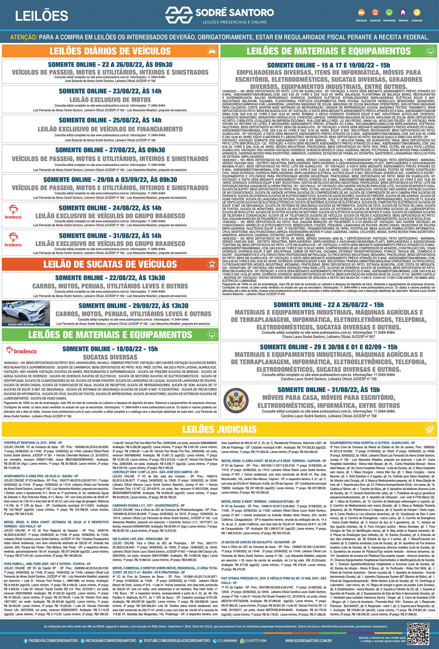 www.jornalprimeirolance.com.br- Pág. 12 - Ano XIII-nº1128 BRASIL: São Paulo, 15 a 21 de Agosto, de 2022 Jornal Primeiro Lance LEILÃO PRESENCIAL E www.leilaoonline.netON-LINE LEILÃO PRESENCIAL Pça dos Omaguás 98 S. Paulo - SP 25 / AGOSTO / 2022 - 5ª Feira - 14:30 HS LEILÃO PRESENCIAL E www.leilaoonline.netON-LINE LEILÃO PRESENCIAL Pça dos Omaguás 98 S. Paulo - SP 26 / Agosto / 2022 - Sexta - 11:30 HS & Outros LEILÃO PRESENCIAL E www.leilaoonline.netON-LINE LEILÃO PRESENCIAL Pça dos Omaguás 98 S. Paulo - SP 19 / AGOSTO / 2022 - Sexta - 11:30 HS & Outros LEILÃO PRESENCIAL E www.leilaoonline.netON-LINE LEILÃO PRESENCIAL Pça dos Omaguás 98 S. Paulo - SP 25 / AGOSTO / 2022 - 6ª Feira - 14:30 HS LEILÃO PRESENCIAL E www.leilaoonline.netON-LINE LEILÃO PRESENCIAL Pça dos Omaguás 98 S. Paulo - SP 24 / AGOSTO / 2022 - 4ª Feira - 15:30 HS LEILÃO PRESENCIAL E www.leilaoonline.netON-LINE LEILÃO PRESENCIAL Pça dos Omaguás 98 S. Paulo - SP 17 / AGOSTO / 2022 - 4ª Feira - 15:30 HS