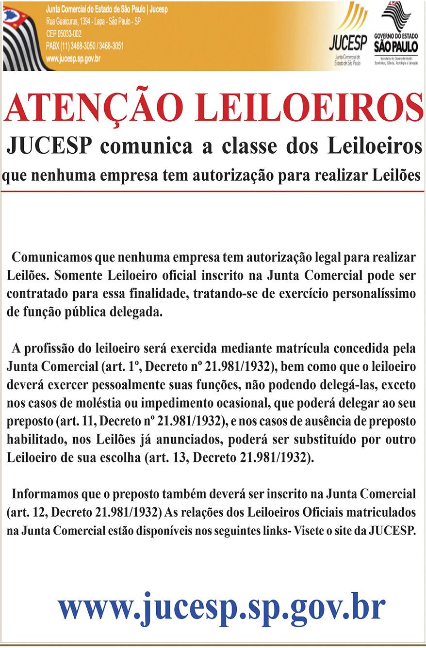www.jornalprimeirolance.com.br- Pág. 2 - Ano XIII-nº1128 BRASIL: São Paulo, 15 a 21 de Agosto, de 2022 Jornal Primeiro Lance #protegeraleidoleiloeiroénossaobrigação : (0xx11) 95424-0821 - 3733-1904 DIRETOR RESPONSÁVEL E REPORTAGEM: Mauro Candido Camargos DIREÇÃO EXECUTIVA: Vanilda Candido da Silva EDITOR : Passos Camargos Jornalista Responsável: Terezinha F. dos Santos - MTB25816/SP Diretor Jurídico: Dr. Jorgiano Nogueira - OAB/SP n.º 50.326 Consultor : Joaquim De’Carli de Paula O JPL também utiliza os serviços da agência Brasil, de Brasília/DF. As matérias assinadas não representam necessariamente a opinião deste jornal. As artes finais dos anúncios e editais de divulgação publicados nas edições do jornal são de responsabilidade dos anunciantes. Circulação: Internacional www.jornalprimeirolance.com.br Expediente Jornal Primeiro Lance é editado pela Editora Primeiro Lance Rua Ramos de Oliveira, 178 - CEP: 08051-500 - São Paulo jornalprimeirolance@gmail.com - redacaobirojpl@gmail.com passoscamargos@gmail.com - vanildacandido@gmail.comwww.rossileiloes.com.br