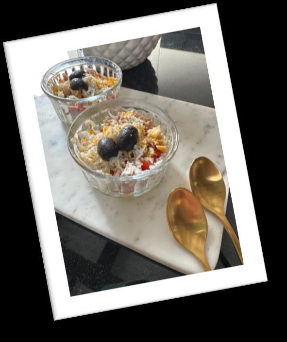 1. Ensaladilla estilo Elsa con tomate, pepino, huevo rallado, pimienta, aceiteyaceituna.