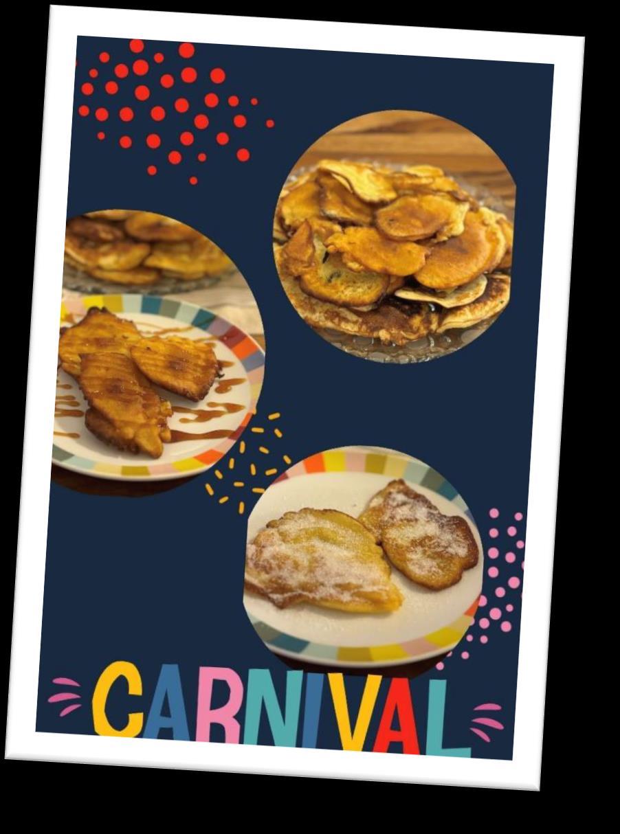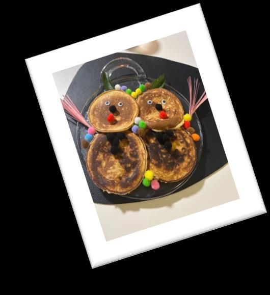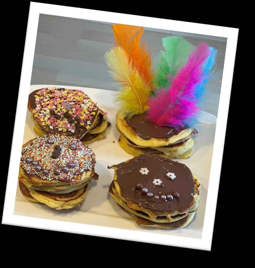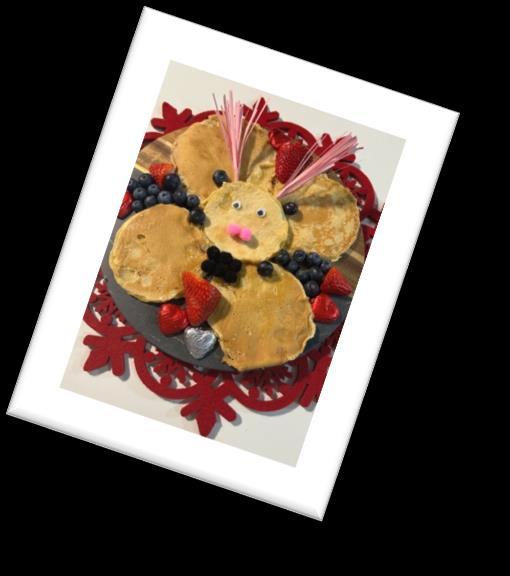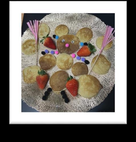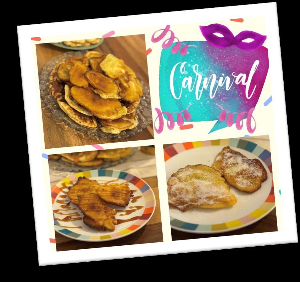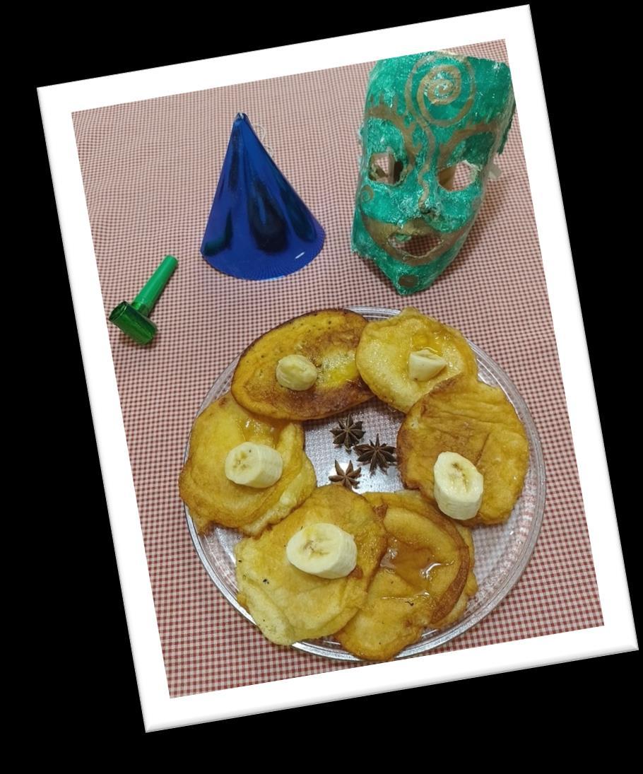 Para celebrar este carnaval hemos elaborado un las hemos decorado. Primero, para la masa líquida hemos mezclado harina, leche, levadura, huevo, mantequilla y yogurt natural. Con la masa ya hecha y la sartén precalentada empezamos a esparcir la masa en pequeños círculos uniformes. Después de un par de segundos la masa estaba ya hecha por un lado. Para estar seguros de que la masa estaba hecha nos esperábamos a que hubieran pequeñas burbujas en la masa, lo que indica que la otra parte ya está hecha y seguidamente dábamos la vuelta a las tortillas. Finalmente decoramos las tortillas en este caso con algo de fresas y también unas cuantas bolitas decorativas y ojos para conseguir un tipo de disfraz para hacer referencia a este festivo lleno en abundancia con disfraces, decoraciones y muchas otras particularidades.