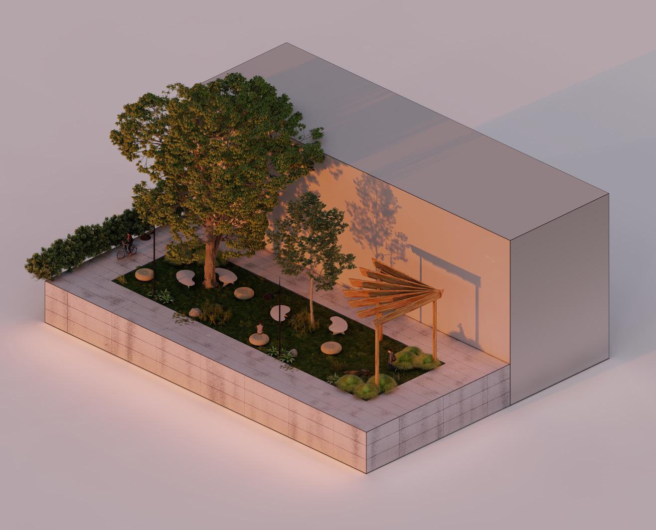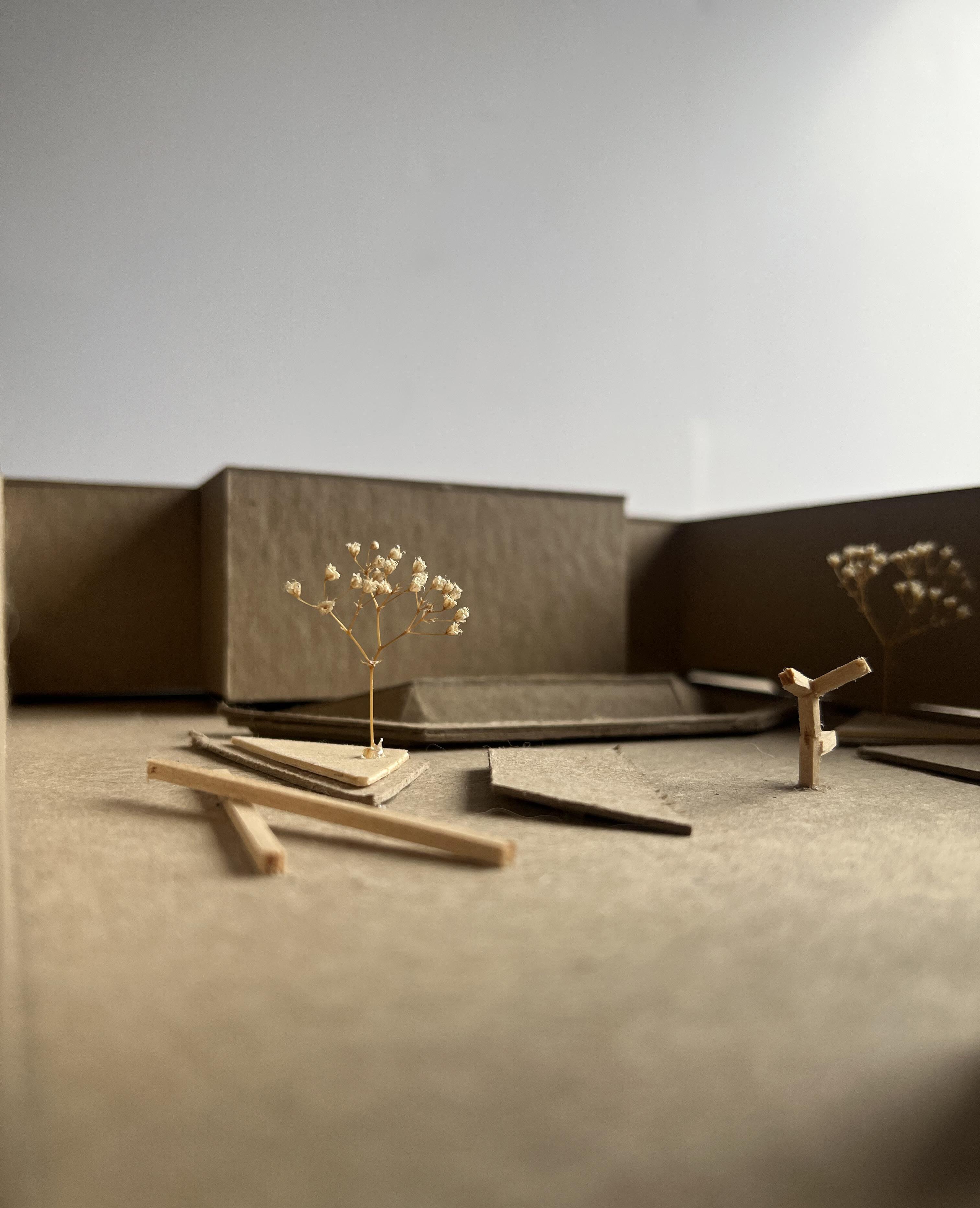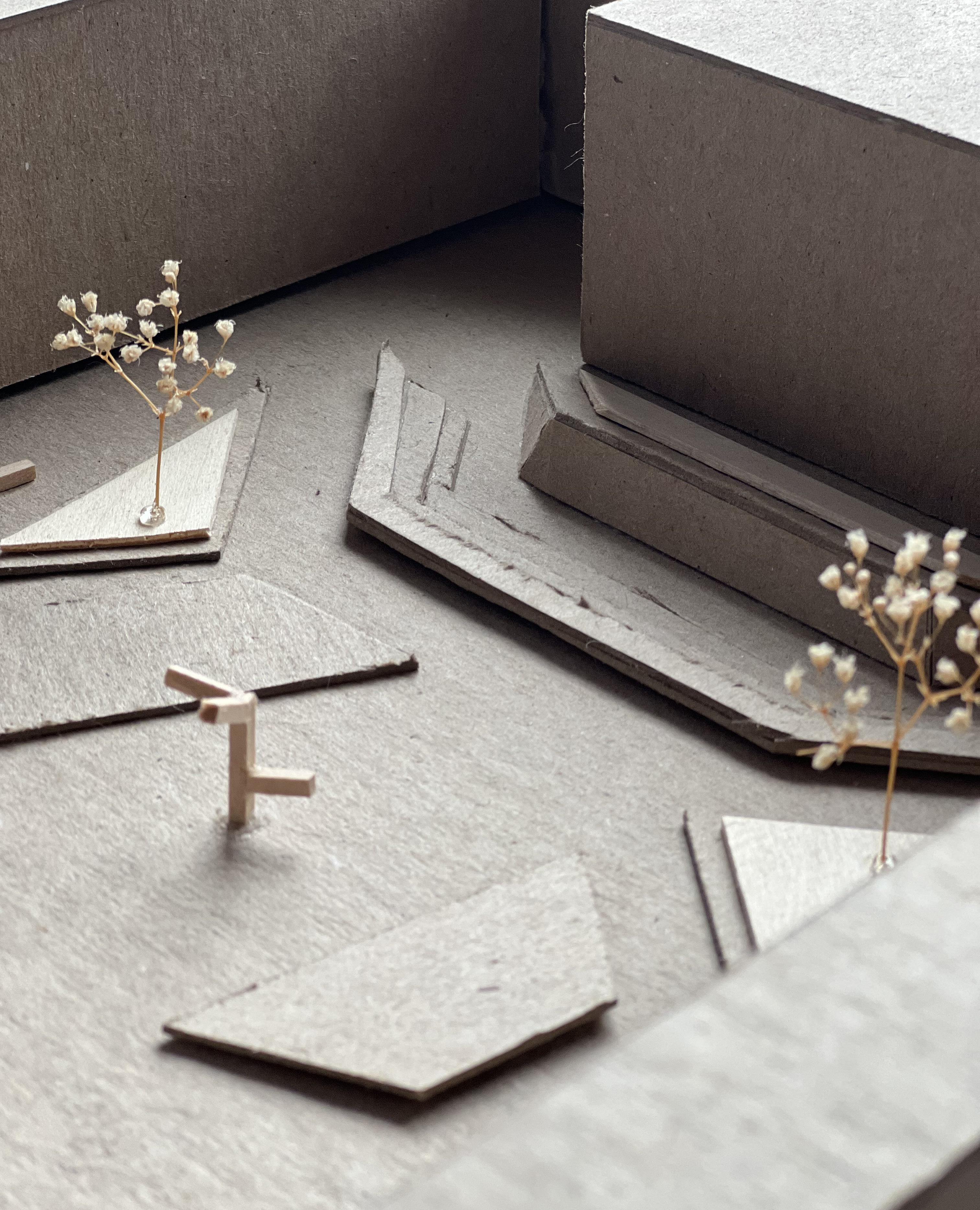 I was assigned with a sculpture at the beginning of the project and then had to design the new courtyard based on that sculpture. A mockup of the sculpture can be seen in the model pictures. Using the sharp edges and angles of that sculpture I created spaces that used that same geometry. The small amphitheater and the planter boxes both have those features previously mentioned. The whole site revolves around the sculpture making sure that there is an established connection between the site and the source of inspiration.