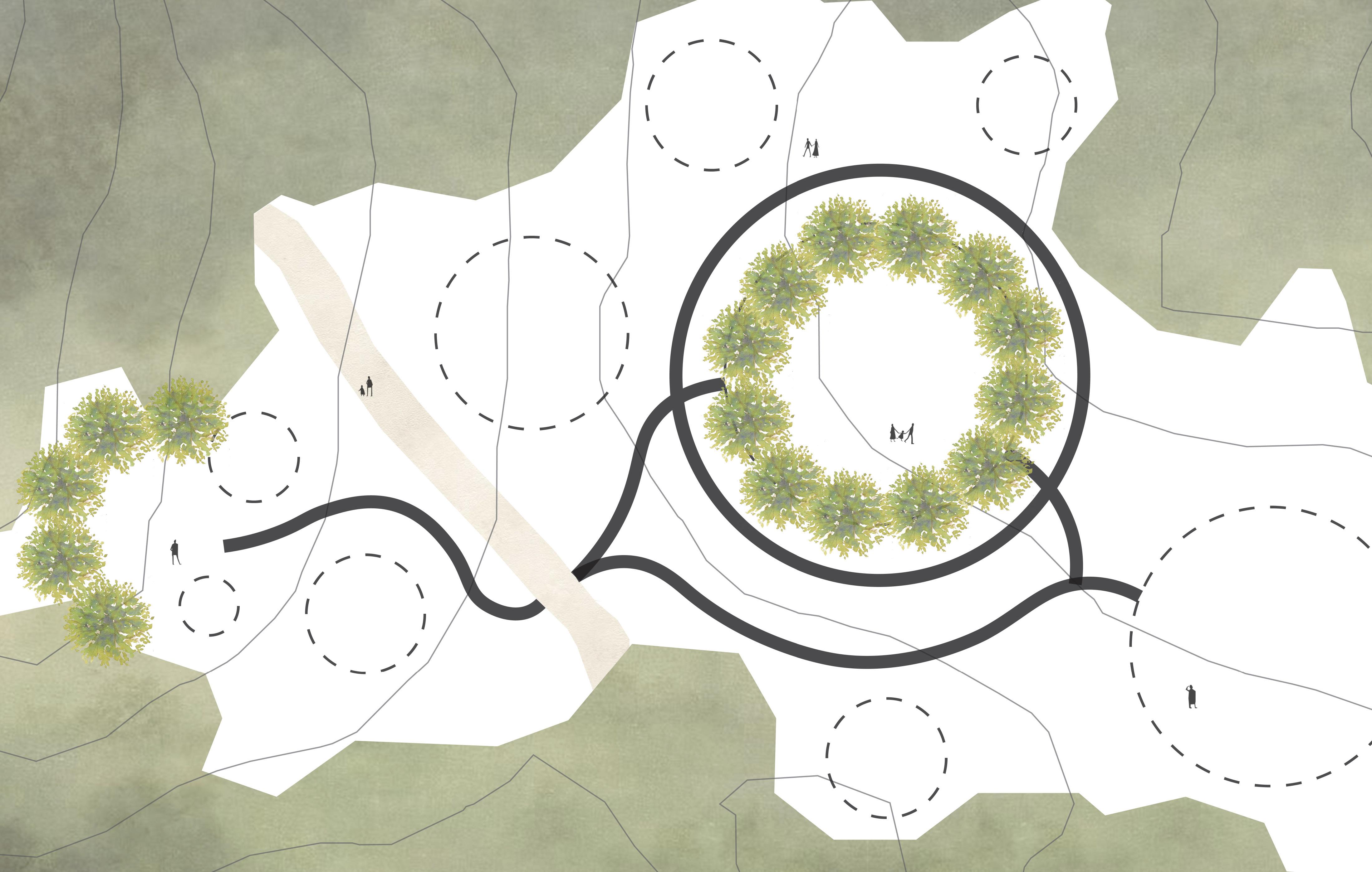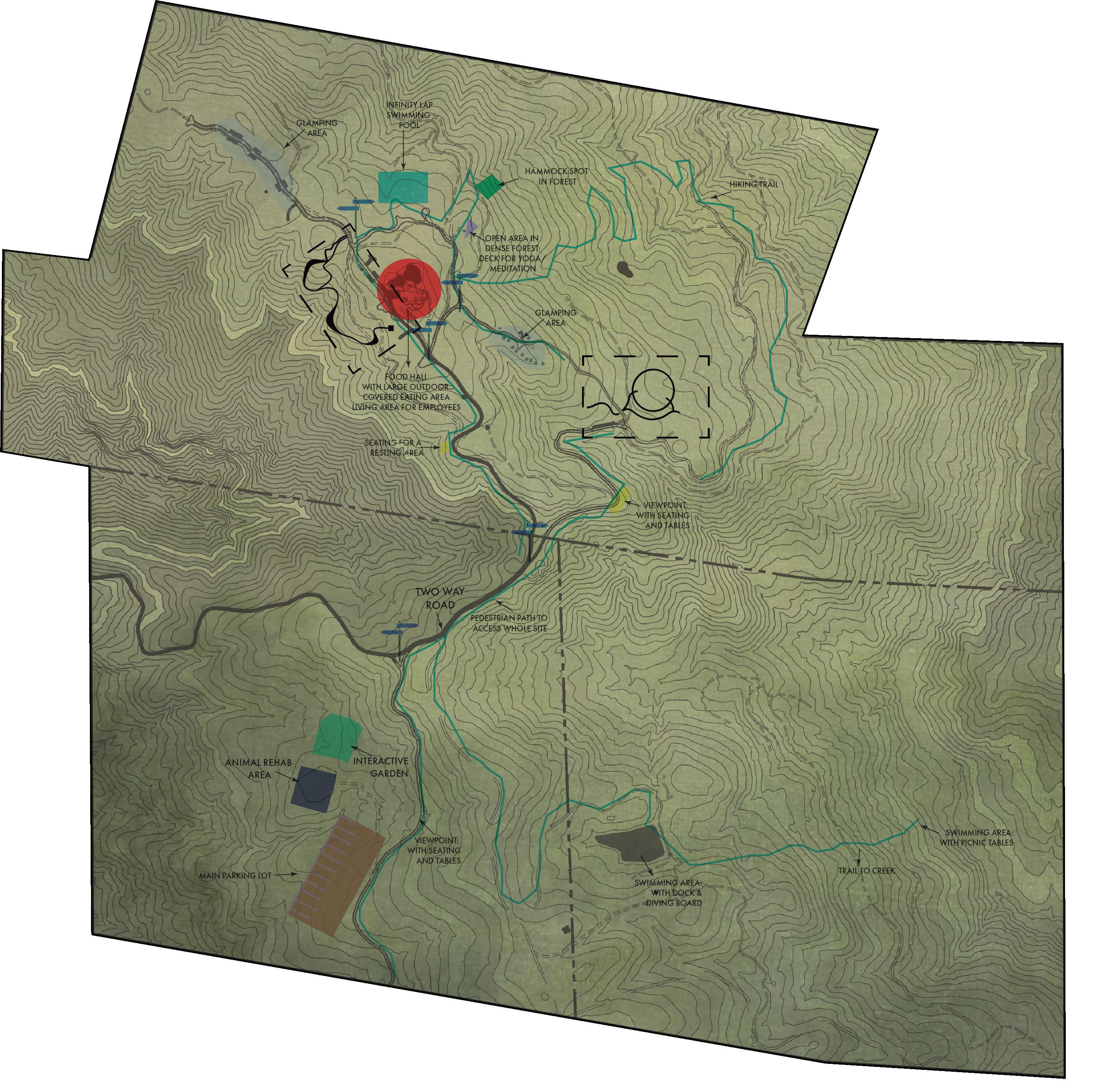 Teravana is an existing project that is still currently under construction. The site is meant to be used as one of nature’s sanctuaries, in which people can go and re-establish a close connection with nature. I had to create an area within that site that followed those same principles while also establishing my own theme. I wanted the space to be able to elevate the mind, body and environment. In order to do so I wanted to create a sculpture garden that led to an amphitheater surrounded by a grove of redwood trees. The large open space provided for perfect open areas where scupltures could be situated. The newly established gardens would allow one’s mind to be elevated through the art, the body through the wild terrain and the environment through a mutual relationship with the visitor.