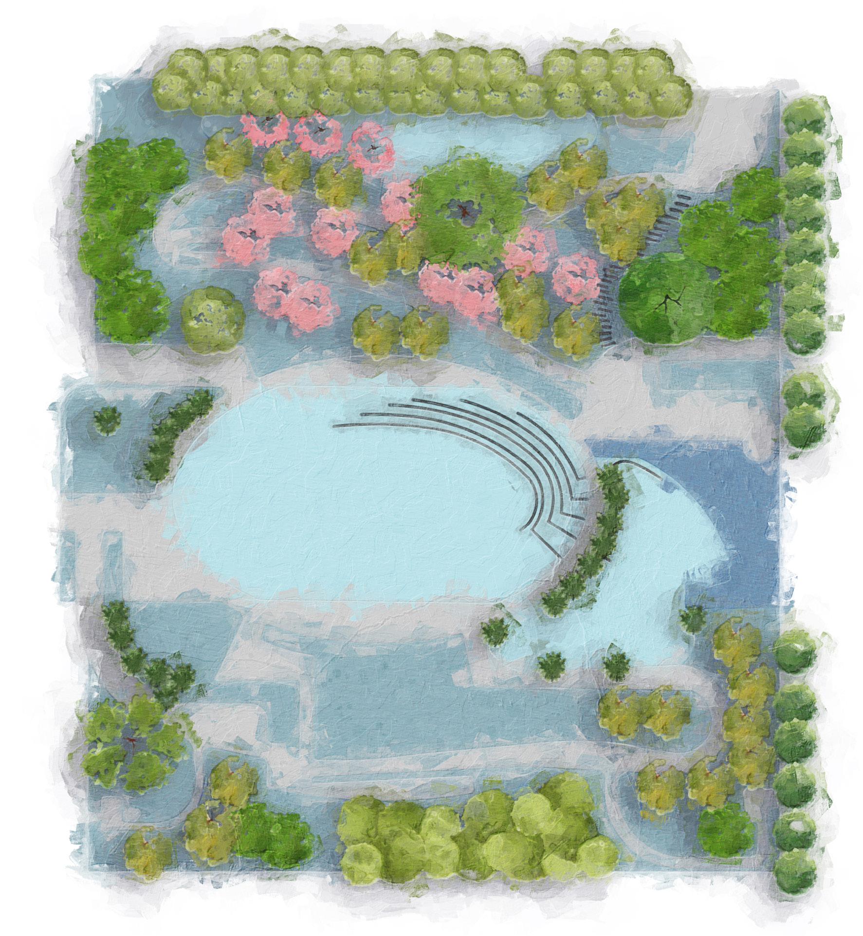 For this project I had to find an artist and an existing park with around five acres in size. I chose Monet as my artist and Francisco Park as my site. I then had to recreate the plan and section of the park on autocad and create an artistic version of each. I focused on Monet’s water lillies series and stylized the site plan as a body of water with the public areas as the lilly pads. I then used the same color palette and created the renders with an impressionist influence.