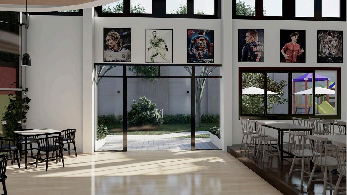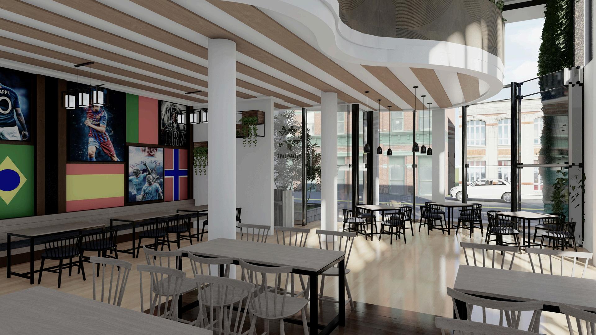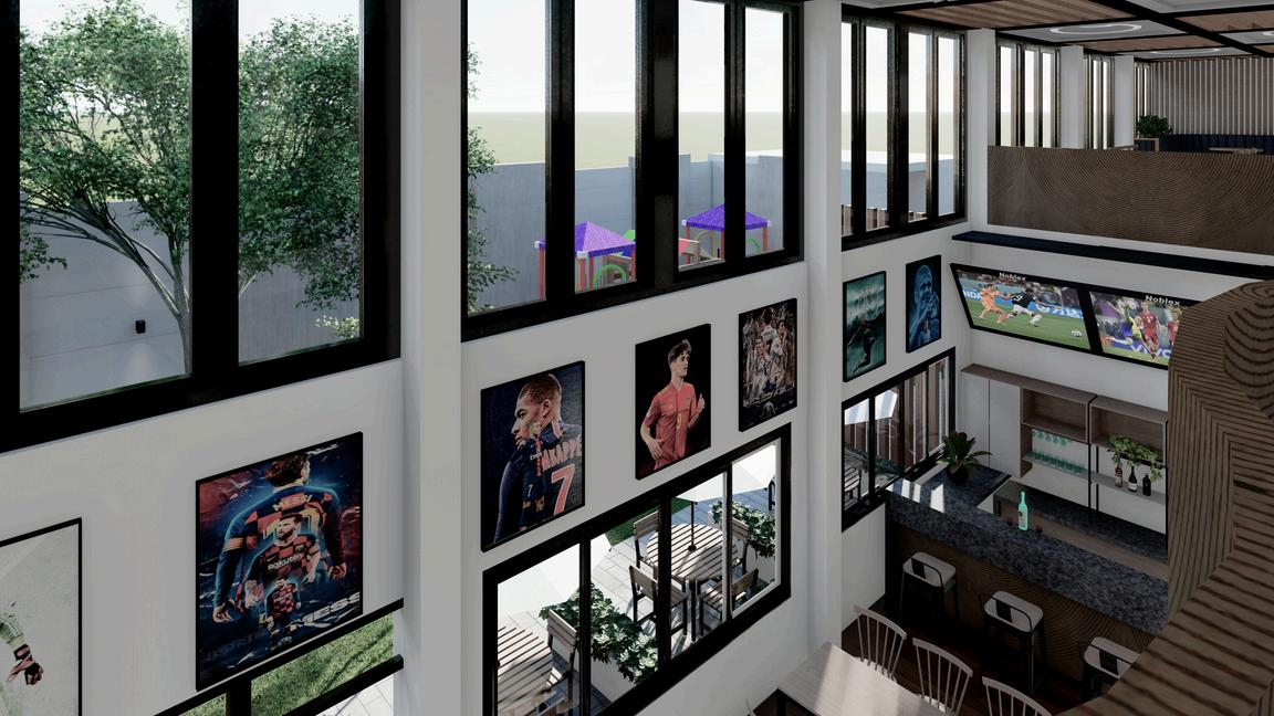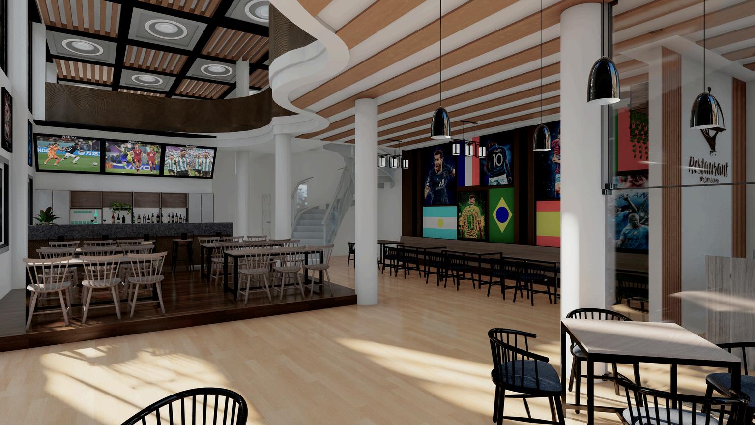 Este diseño es una propuesta de diseño para un restaurante-cafetería de dos niveles con una temática deportiva.