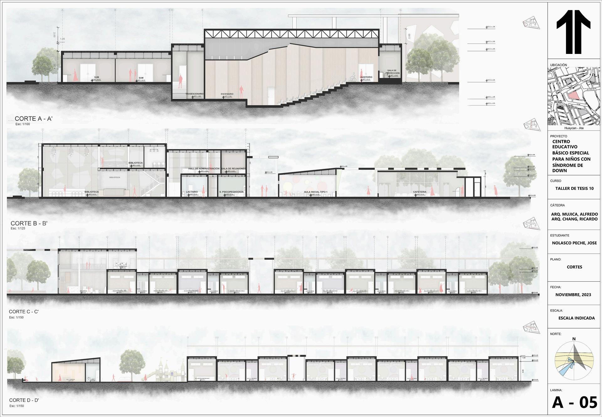 En estos cortes hacemos notar la intención de generar espacialidad e interconectar ciertos espacios visualmente, ademas dándole continuidad en la circulación tanto vertical como horizontal, a su ves generando volados y terrazas.