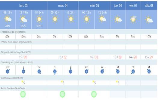 Debuta octubre y lo hace con un poco de todo, pero muy poco de nada. Así, en este inicio de sema na podremos tener algo de lluvias, aunque como decimos, no será nada significativo. Las tempera turas tampoco destacarán por su excesivo calor o desmesurado frío. De hecho tendremos días de manga corta y noches de algo de abrigo merced a los treinta y dos grados que se alcanzará este mar tes y miércoles y los catorce que se preveen en el fin de semana. Sin embargo, ni un extremo ni otro supondrá un cambio radical con la media semanal. De esta manera las máximas rondarán los treinta y las mínimas los quince. Habrá que esperar alguna semana más para ver si el cambio en el tiempo es algo más significativo.