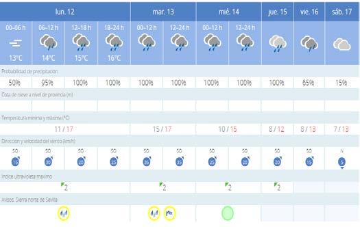 Una semana más, y ello nos llena de alegría, tenemos que hablar de precipitaciones. Unas precipitaciones que se alargan durante casi toda la semana y que nos deja esa bendición del cielo que tanta falta nos hace. Lluvias que no caen de mala manera ni con una intensidad inusitada, sino que lo hacen de forma constante, en cantidad suficiente para que nuestro campo la aproveche de una manera adecuada. Estas lluvias estarán con nosotros, al menos, hasta el viernes. A partir de ahí incertidumbre total. En cuanto a las temperaturas, tanto en las máximas como en las mínimas, la tendencia es a disminuir a medida que avance la semana. Así, pues, a disfrutar de esta necesaria lluvia.