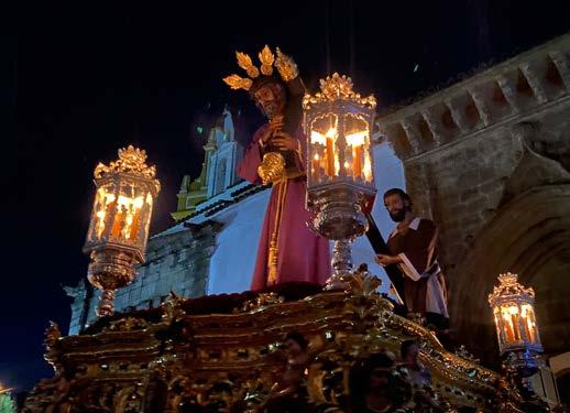 Ntro. Padre Jesús, ilustre devoción de Guadalcanal aún no ha salido por la puerta de Sta. María de la Asunción y ya hay un pueblo que impaciente le espera. Un hormiguero de personas se apresura a coger el mejor sitio para que su vista se vea agraciada con ese momento tan mágico y especial. Sobre sus pies el suelo empieza a temblar al son de un pasacalles, el que trae, no se sabe desde donde, la Agrupación Musical de la Sagrada Cena de Plasencia. Ellos, agradecidos por la oportunidad de tocarle al nazareno, Guadalcanal, agradecido por contar con sus sones. Y mientras el suelo vibra el corazón se acelera por la inminencia de ese tiempo que en la torre del reloj ve llegar su momento.