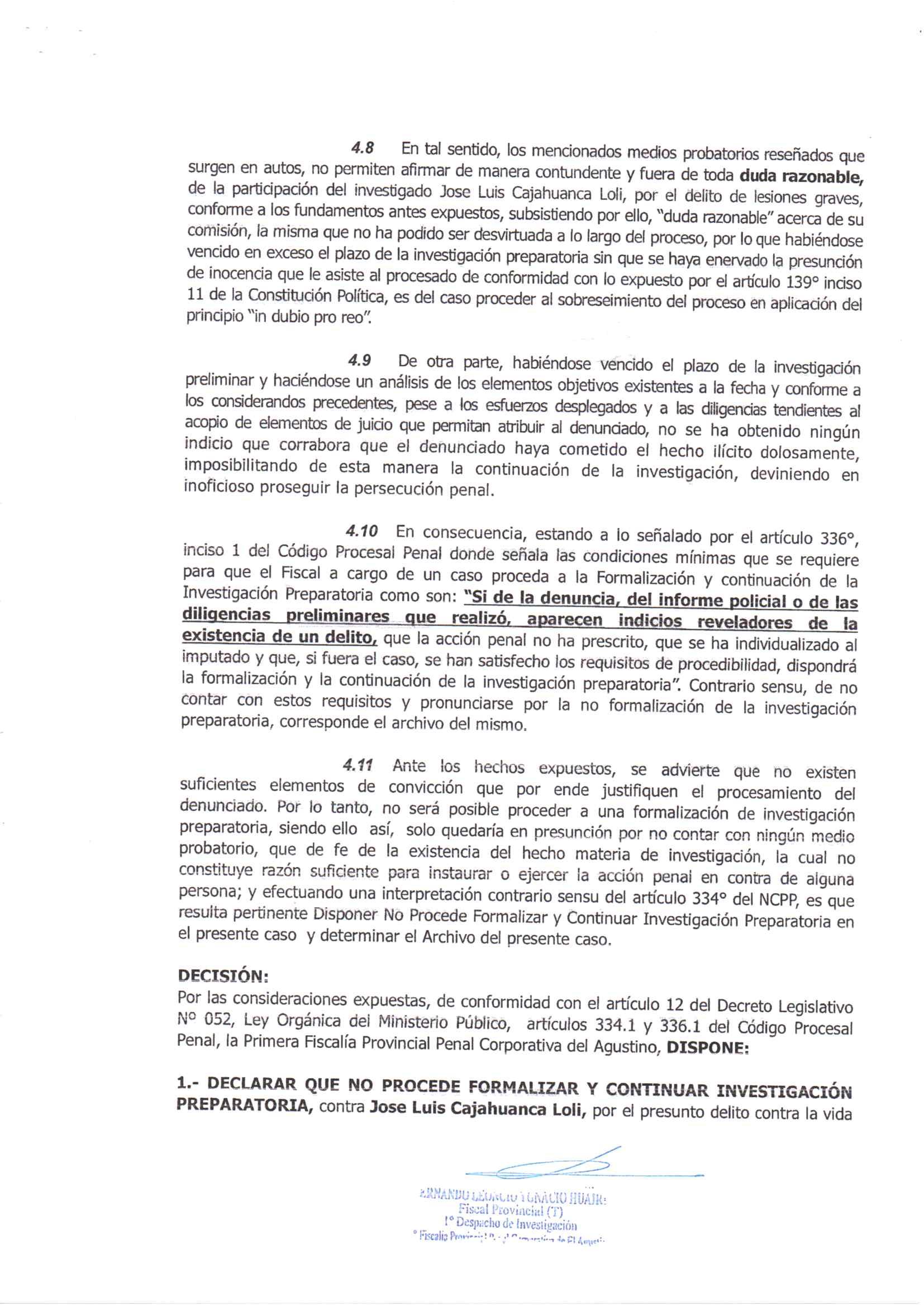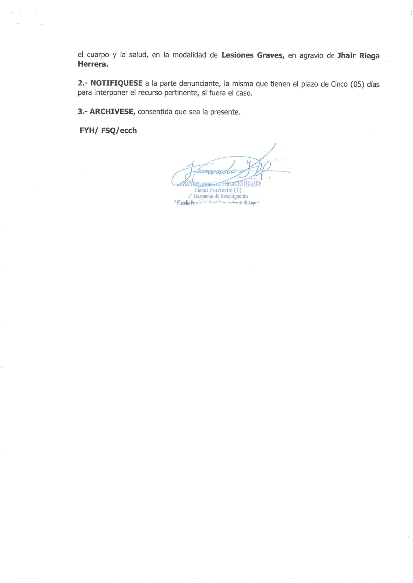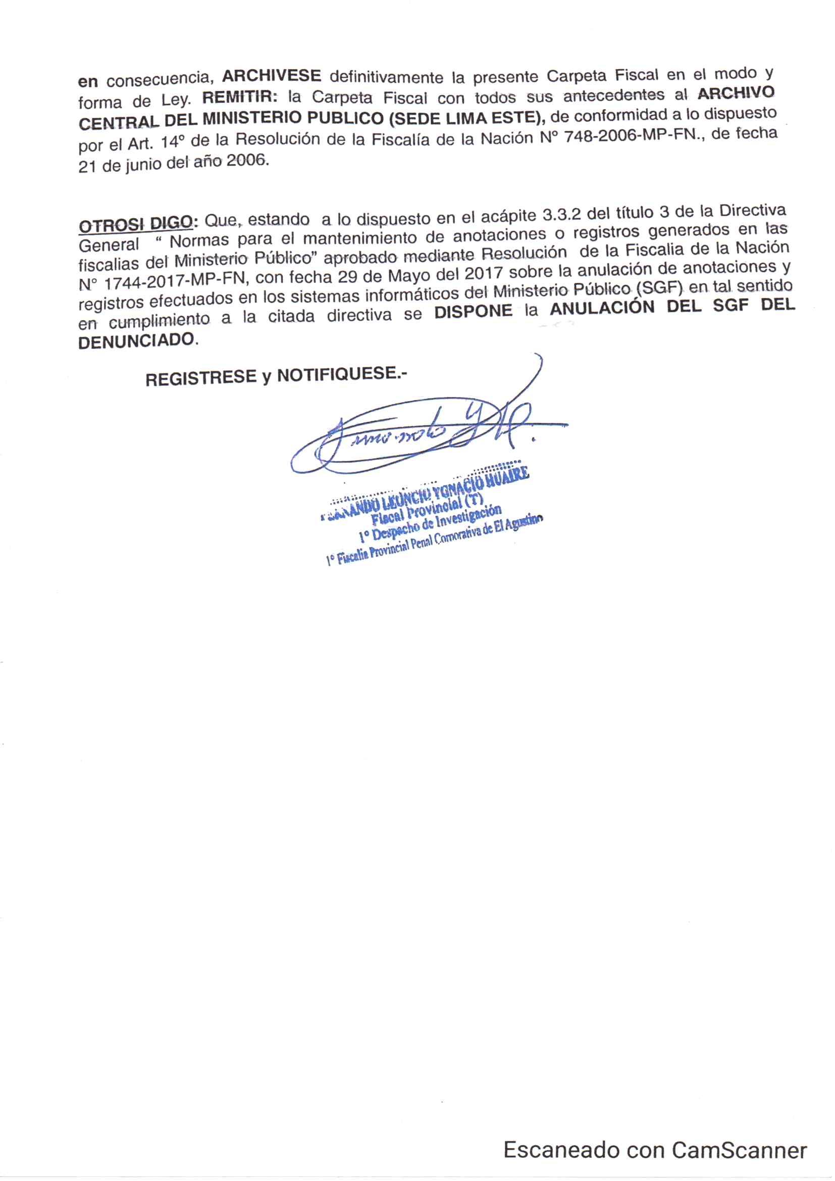 Ante notas periodísticas publicada La República y El Comercio, la fiscalía me dió la razón al archivar el caso y no encontrar medios probatorios en mi contra. Ante lo expuesto, dicha nota debe retirarse o emitir una publicación de rectificación que se adjunte el documento de la Fiscalía Provincial Penal Coporativa de El Agustino en la nota publicada por su medio periodístico ya que me perjudica de forma laboral, profesional y emocional. Asimismo indico que ante la fiscalía se dispuso su inmediato archivamiento, así como la anulación de la denuncia ya que según lo indica el numeral 4.11 del caso "...Se advierte que no existen suficientes elementos de convicción que por ende justifiquen el procesamiento del denunciado. Por lo tanto no será posible proceder a una formalización de investigación preparatoria, siendo ello así, solo quedaría en presunción por no contar con ningún medio probatorio, que de fe de la existencia del hecho materia de investigación..."