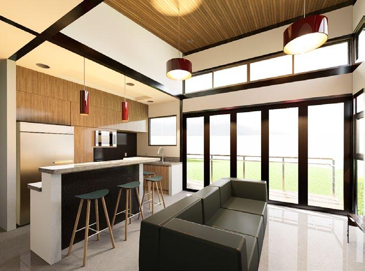 It has features such as: modular design, electrical self-sufficiency, water harvesting system, selfcultivation orchard, low carbon footprint (natural materials grown in the country); almost zero impact on natural terrain; and low construction times.