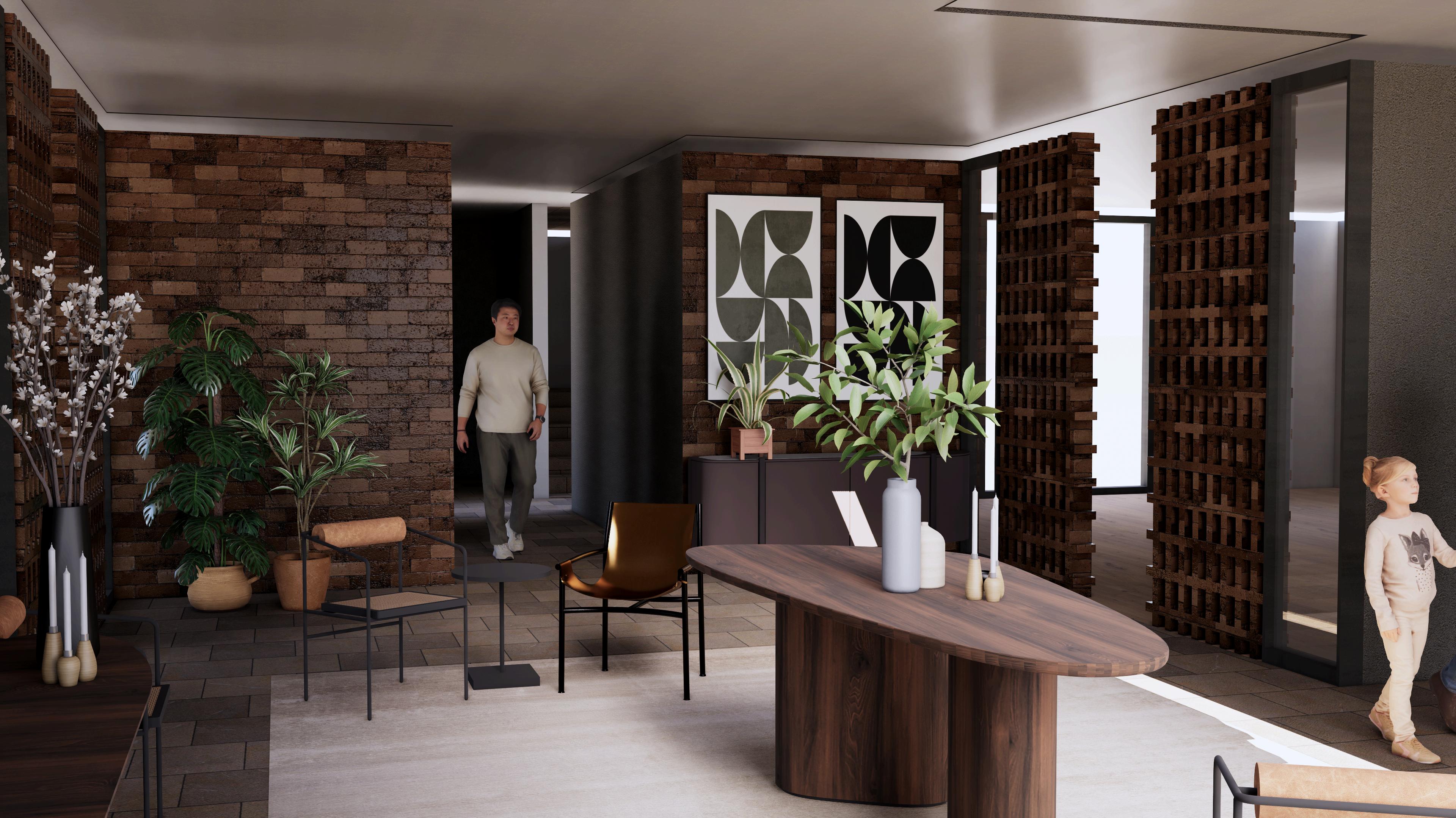 El lenguaje arquitectónico combina el brutalismo contemporáneo con elementos cálidos, empleando materiales como acero oxidado, concreto pulido, madera de encino y piedra blanca
