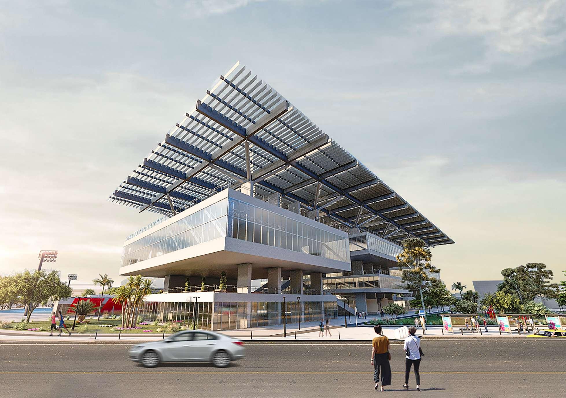 A building in front of Cevallos Park that integrates its first floor as an extension of the public space and promote local entrepreneurships generating a pedestrian access to the building.