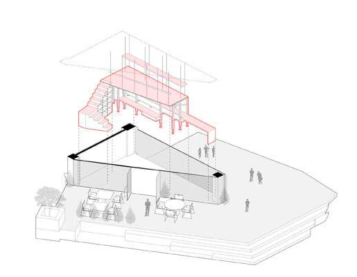 The construction system is based on a same module that repeats itself as frames. These are stiffened by means of planks that are thought of as functional surfaces for the preparation bar, service bar and mezzanine surface.