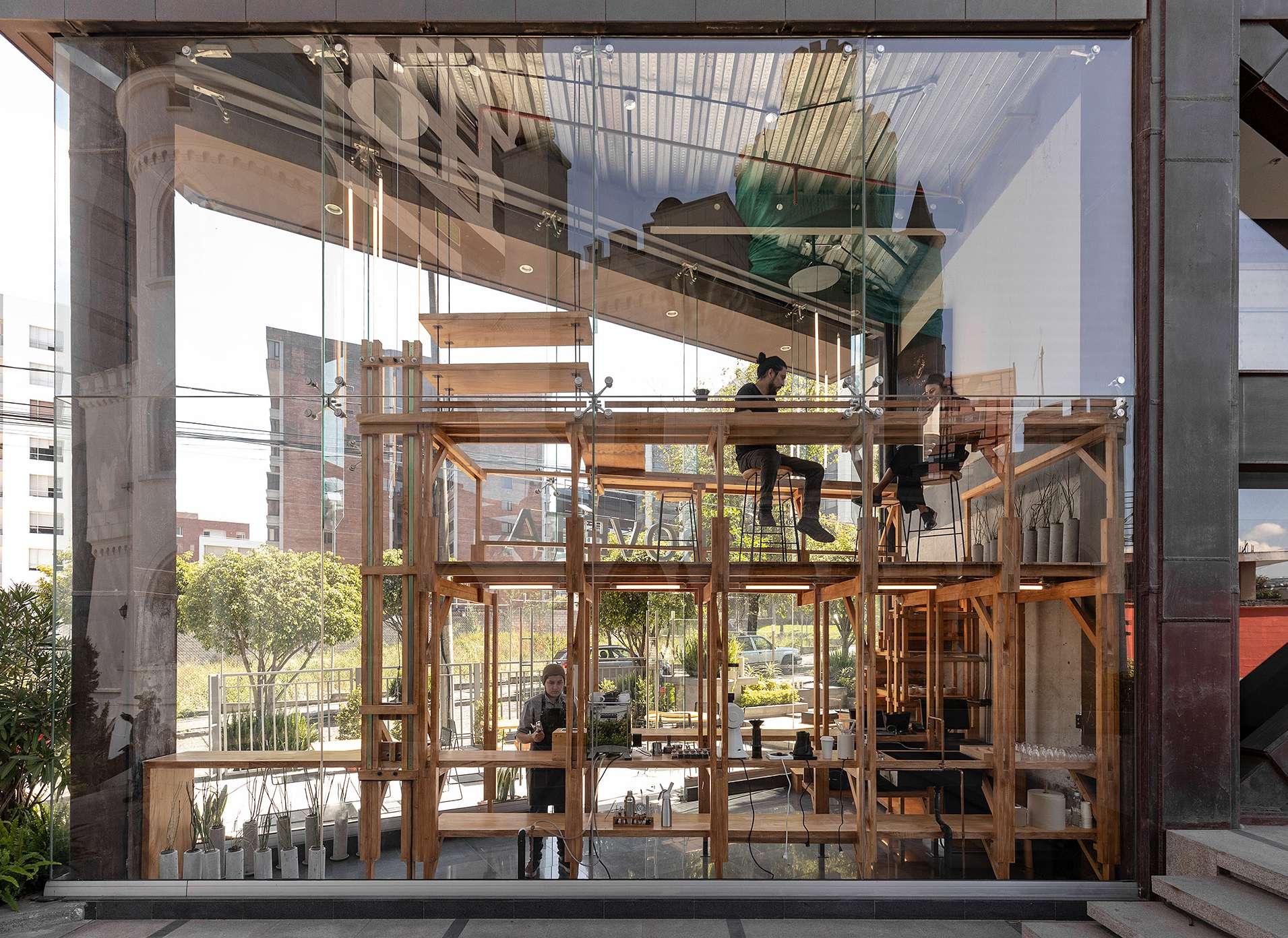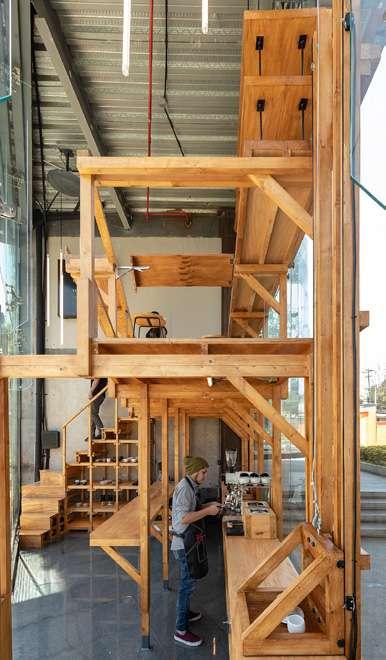 The piece of furniture generates two differentiated spaces. On the ground floor, a showroom-type space is proposed, where each action is part of a showcase to appreciate the products, preparation, and the coffee roasting process from every angle. The mezzanine is a seating and tasting area surrounded by a continuous bar, from which you can appreciate another perspective of the place and its views. These two environments are interconnected by means of small-scale forklifts that allow the transfer of drinks, this mobile element is designed from the same wooden system from the furniture which becomes the link between the user above and below. There is a terrace as a lobby where modular furniture is designed to facilitate storage inside the cafeteria.