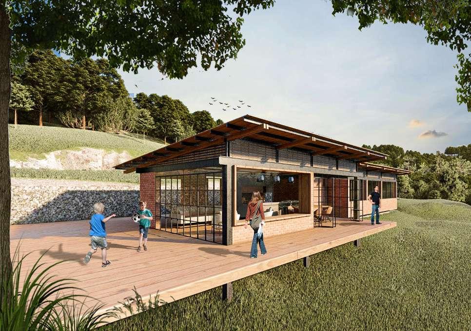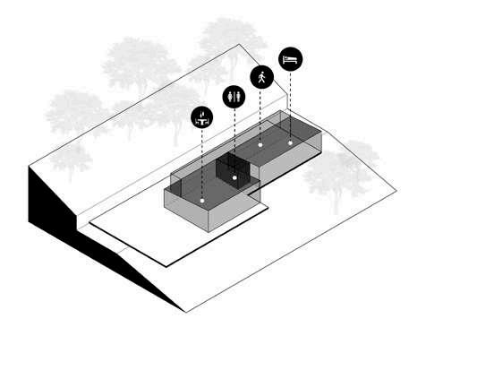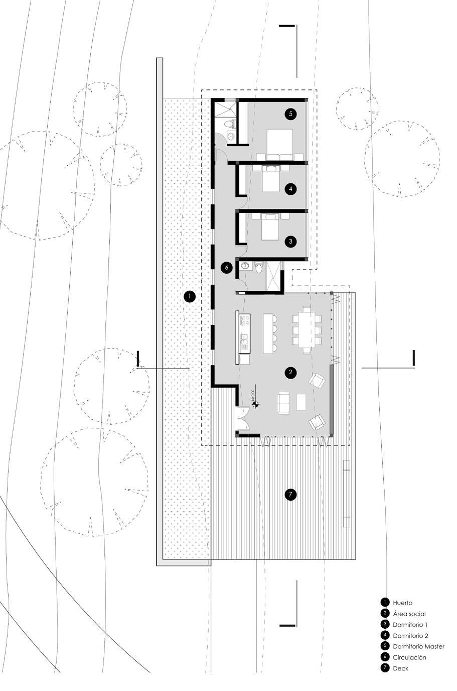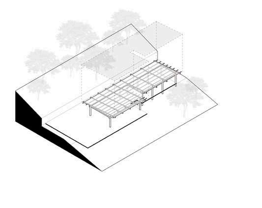 Un espacio pensado desde lo modular y la posibilidad de desmontarlo si se requiere, las piezas son estandarizadas y ensambladas por m edio de ornillería. Se p iensa en u n sistema d e paneles tamborados, con una cara de contrachapado, aislante érmico d e membrana térmica y enduelado. Este m ódulo g enera u n marco que une el jardín posterior pegado a la oma y la vista al valle de Tumbaco. Un espacio de descanso que se posa en las nubes y remata el proyecto con un elemento singular.