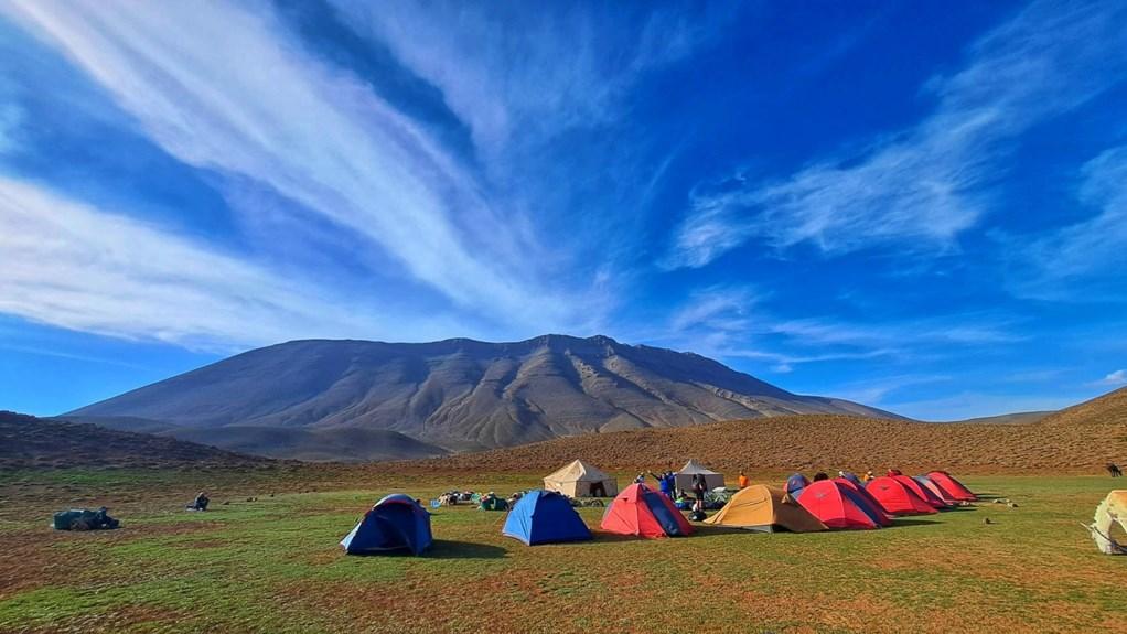 El gélido viento que sopla no deja disfrutar todo lo que quisiéramos de la cumbre, pero perdiendo altura rápidamente por las pedreras de su cara norte, el sol del mediodía y el estar protegidos del viento hace que el termómetro se dispare. El entorno que nos rodea es grandioso y el descenso por esta vertiente norte se hace entretenido por los barrancos secos que desagüan de la línea de cumbres. Alcanzamos nuestro nuevo vivac ubicado en la confluencia de dos torrenteras secas junto a una planicie donde un rebaño de un pastor nómada aprovecha el escaso pasto existente a 2.800 metros.