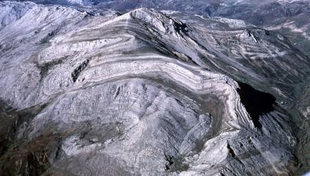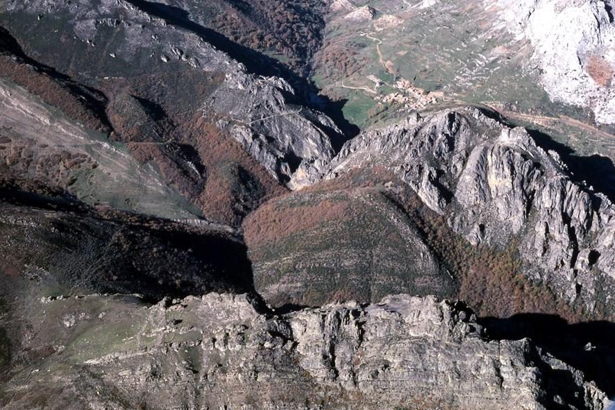 - Ejemplos de deformaciones en rocas de la Cordillera Cantábrica. Arriba se ven pliegues afectando a calizas devónicas y carboníferas en la zona del pico Polvoreda. Abajo, un pliegue repite la Cuarcita de Barrios en la parte inferior y la parte superior de la foto, al norte de La Vecilla de Curueño y en los alrededores del pueblo de La Valdorria que aparece en la imagen.